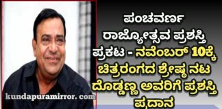 ಕೋಟ :ಪಂಚವರ್ಣ ರಾಜ್ಯೋತ್ಸವ ಪ್ರಶಸ್ತಿ ಪ್ರಕಟ – ನವೆಂಬರ್ 10ಕ್ಕೆ ಚಿತ್ರರಂಗದ ಶ್ರೇಷ್ಠ ನಟ ದೊಡ್ಡಣ್ಣ ಅವರಿಗೆ ಪ್ರಶಸ್ತಿ ಪ್ರದಾನ