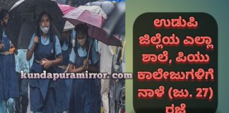 ಉಡುಪಿ ಜಿಲ್ಲೆಯ ಎಲ್ಲಾ ಶಾಲೆ, ಪಿಯು ಕಾಲೇಜುಗಳಿಗೆ ನಾಳೆ (ಜು. 27) ರಜೆ