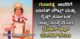 ಕುಂದಾಪುರ :ಗುಣರತ್ನ ಅವರಿಗೆ ಭಾರತ್ ಸೌಟ್ಸ್ ಮತ್ತು ಗೈಡ್ಸ್ ಕರ್ನಾಟಕ ರಾಜ್ಯ ಸಂಸ್ಥೆಯಿಂದ ಮೆಡಲ್ ಆಫ್ ಮೇರಿಟ್ ಸೇವಾ ಪದಕ