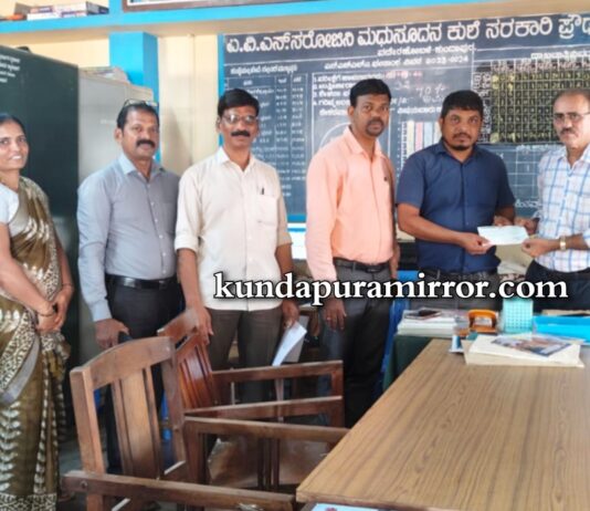 ಸರಕಾರಿ ಪ್ರೌಢ ಶಾಲೆಗೆ ಒಂದು ಲಕ್ಷ ರೂಪಾಯಿ ಆರ್ಥಿಕ ನೆರವು ನೀಡಿದ ಹೆಮ್ಮಾಡಿ ಜನತಾ ಪಿಯು ಕಾಲೇಜಿನ ಅಧ್ಯಕ್ಷರಾದ ಗಣೇಶ್ ಮೊಗವೀರ