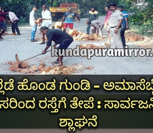 ಕುಂದಾಪುರ :ಎಲ್ಲೆಡೆ ಹೊಂಡ ಗುಂಡಿ – ಅಮಾಸೆಬೈಲು ಪೊಲೀಸರಿಂದ ರಸ್ತೆಗೆ ತೇಪೆ : ಸಾರ್ವಜನಿಕರಿಂದ ಶ್ಲಾಘನೆ