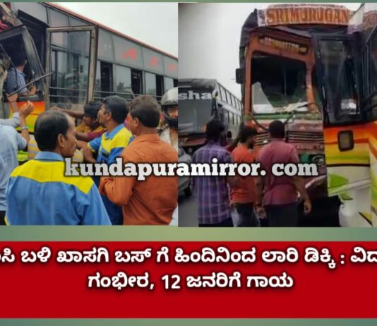 ತಲ್ಲೂರು: ಪ್ರವಾಸಿ ಬಳಿ ಖಾಸಗಿ ಬಸ್ ಗೆ ಹಿಂದಿನಿಂದ ಲಾರಿ ಡಿಕ್ಕಿ : ವಿದ್ಯಾರ್ಥಿ ಗಂಭೀರ, 12 ಜನರಿಗೆ ಗಾಯ