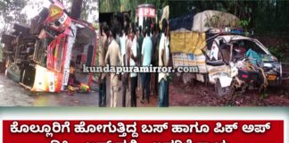 ಕುಂದಾಪುರ: ಕೊಲ್ಲೂರಿಗೆ ಹೋಗುತ್ತಿದ್ದ ಬಸ್ ಹಾಗೂ ಪಿಕ್ ಅಪ್ ಡಿಕ್ಕಿ -ಬಸ್ ಪಲ್ಟಿ, ಐವರಿಗೆ ಗಾಯ