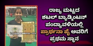 ರಾಜ್ಯ ಮಟ್ಟದ ಶಟಲ್ ಬ್ಯಾಡ್ಮಿಂಟನ್ ಪಂದ್ಯಾವಳಿಯಲ್ಲಿ ಗಂಗೊಳ್ಳಿಯ ಎಸ್.ವಿ. ಆಂಗ್ಲ ಮಾಧ್ಯಮ ಶಾಲೆಯ ಪ್ರಾರ್ಥನಾ ಪೈ ಅವರಿಗೆ ಪ್ರಥಮ ಸ್ಥಾನ