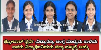 ಕುಂದಾಪುರ :ಥ್ರೋಬಾಲ್ ಸ್ಪರ್ಧೆ; ವಿದ್ಯಾರಣ್ಯ ಆಂಗ್ಲ ಮಾಧ್ಯಮ ಶಾಲೆಯ ಐವರು ವಿದ್ಯಾರ್ಥಿನಿಯರು ಜಿಲ್ಲಾ ಮಟ್ಟಕ್ಕೆ ಆಯ್ಕೆ