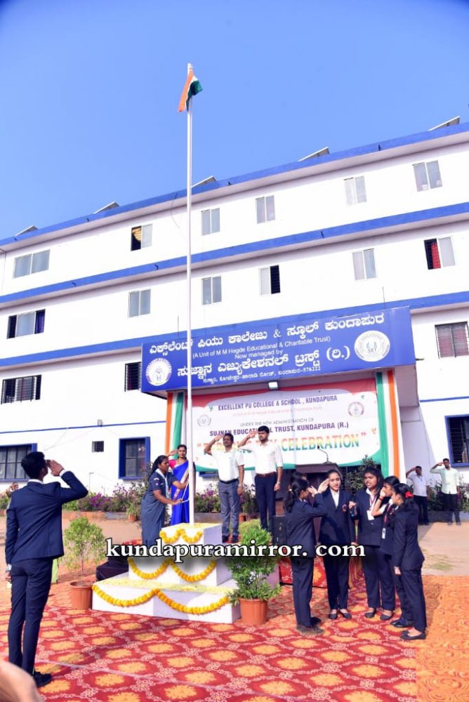 ಕುಂದಾಪುರ :74ನೇ ಗಣರಾಜ್ಯೋತ್ಸವ ದಿನಾಚರಣೆ ಅಂಗವಾಗಿ ಎಕ್ಸಲೆಂಟ್ ಪದವಿ ಪೂರ್ವ ಕಾಲೇಜಿನಲ್ಲಿ ಧ್ವಜರೋಹಣ ನೆರವೇರಿಸಿ ಸುಜ್ಞಾನ್ ಎಜುಕೇಶನಲ್ ಟ್ರಸ್ಟ್ನ ಅಧ್ಯಕ್ಷರಾದ ಡಾ. ರಮೇಶ್ ಶೆಟ್ಟಿಯವರು ವಿದ್ಯಾರ್ಥಿಗಳನ್ನು ಉದ್ದೇಶಿಸಿ “ದೇಶದ ಸಾರ್ವಭೌಮತ್ವ ಏಕತೆ ಮತ್ತು ಅಖಂಡತೆಯನ್ನು ಬಲಿಷ್ಠಗೊಳಿಸುವ ಸಂಕಲ್ಪ ಮಾಡುತ್ತಾ ಶಿಸ್ತುಬದ್ಧವಾಗಿ ಬದುಕೋಣ ಎಂದು ವಿದ್ಯಾರ್ಥಿಗಳಿಗೆ ಕರೆ ನೀಡಿದರು.