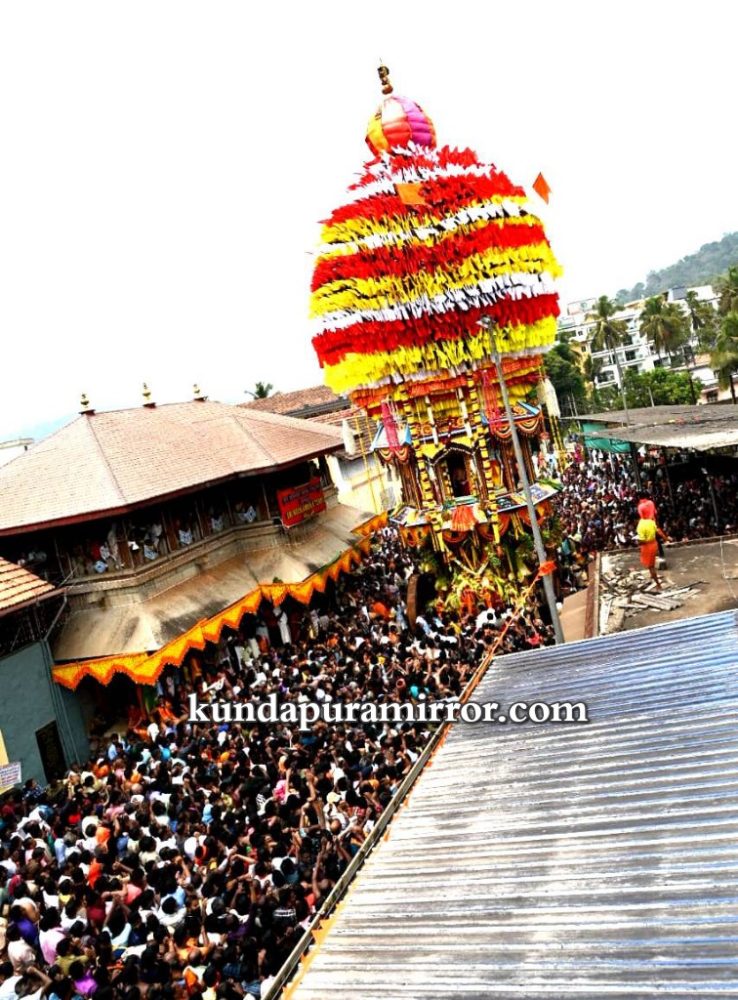 ರಥೋತ್ಸವದ ಅಂಗವಾಗಿ ಬೆಳಿಗ್ಗೆಯಿಂದಲೇ ದೇವಸ್ಥಾನದಲ್ಲಿ ರಥೋತ್ಸವದ ಆಚರಣೆಯಲ್ಲಿ ಅತ್ಯಂತ ಪ್ರಮುಖ ವಿಧಿಗಳನ್ನು ಪೂರೈಸುವ ತಂತ್ರಿ ರಾಮಚಂದ್ರ ಅಡಿಗಳ ನೇತ್ರತ್ವದಲ್ಲಿ ವಿವಿಧ ಧಾರ್ಮಿಕ ಕಾರ್ಯಕ್ರಮಗಳನ್ನು ನಡೆಸಲಾಗಿತ್ತು. ಮುಹೂರ್ತ ಬಲಿ, ಕ್ಷಿಪ್ರ ಬಲಿ ಹಾಗೂ ರಥ ಬಲಿಯ ಬಳಿಕ 12.30 ರ ಮುಥುನ ಲಗ್ನದಲ್ಲಿ ಕೊಲ್ಲೂರಿನ ರಥೋತ್ಸವದ ಪರಂಪರೆಯಂತೆ ಗರ್ಭಗುಡಿಯಿಂದ ತರಲಾದ ಜೋಡಿ (ಎರಡು) ಉತ್ಸವ ಮೂರ್ತಿಗಳನ್ನು ಬ್ರಹ್ಮರಥದಲ್ಲಿ ಕುಳ್ಳಿರಿಸಿ ರಥ ಪೂಜೆ ನಡೆಸಿದ ಬಳಿಕ, ಸಾವಿರಾರು ಭಕ್ತರ ಜಯಘೋಷದ ನಡುವೆ, ಬೀದಿ ಗಣಪತಿ ದೇವಸ್ಥಾನದವರೆಗೆ ರಥೋತ್ಸವ ನಡೆಸಲಾಯಿತು. ಸಂಜೆ 5 ಗಂಟೆಯ ಬಳಿಕ ಬ್ರಹ್ಮರಥದಲ್ಲಿ ದೇವರನ್ನು ಕುರಿಸಿ ರಥಬೀದಿಯಲ್ಲಿ ಬ್ರಹ್ಮರಥವನ್ನು ಶಂಕರಾಶ್ರಮದವರೆಗೆ ಕೊಂಡೊಯ್ಯಲಾಯಿತು. ಜಾತ್ರೆಯ ತೇರಿನ ಈ ವೈಭವಕ್ಕೆ ದೇಶದ ವಿವಿಧ ಭಾಗಗಳಿಂದ ಬಂದಿದ್ದ ಸಾವಿರಾರು ಭಕ್ತರು ಸಾಕ್ಷೀಯಾದರು. ರಥಬೀದಿಯ ಸಂಭ್ರಮದ ಉತ್ಸವಾಚರಣೆಯ ಬಳಿಕ ಶ್ರೀ ದೇವರನ್ನು ರಥದಿಂದ ಇಳಿಸಿ ದೇವಸ್ಥಾನದ ಒಳಗೆ ಕೊಂಡೊಯ್ಯಲಾಯಿತು.