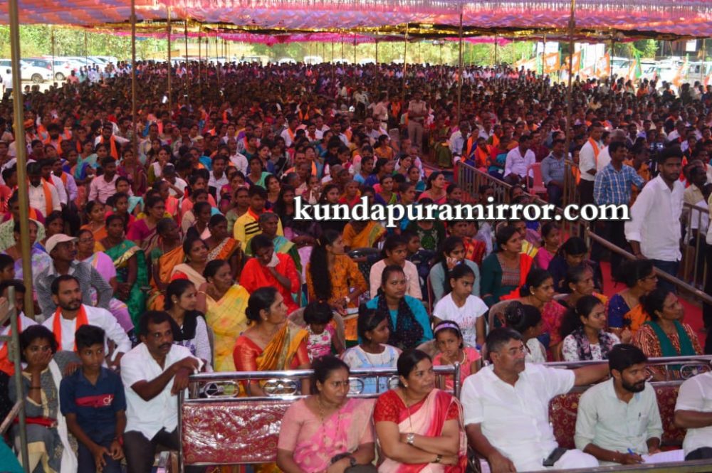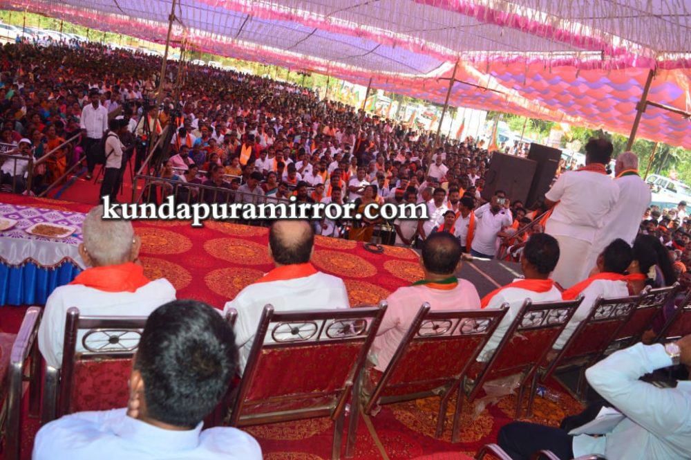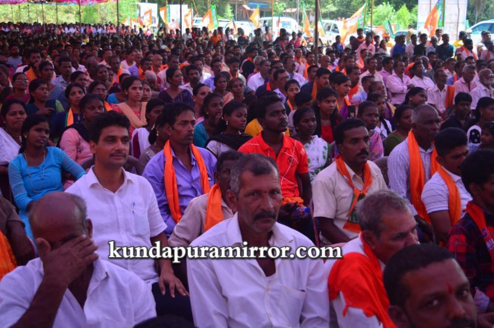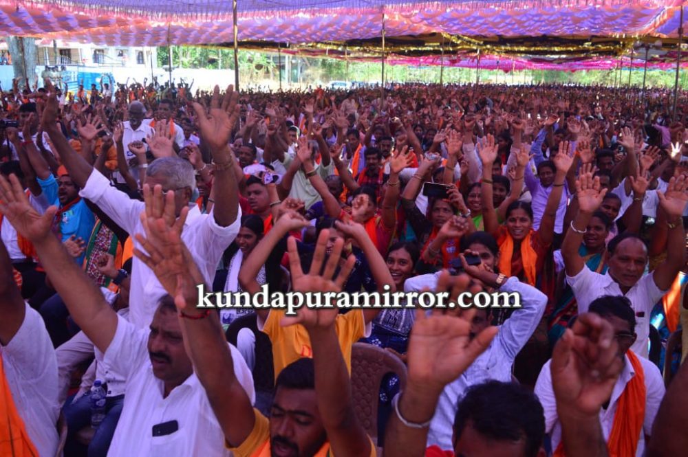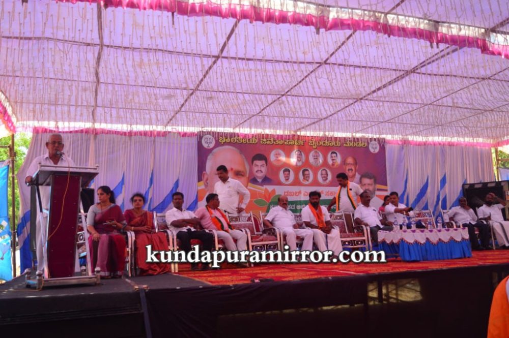 ಭಾರತೀಯ ಜನತಾ ಪಕ್ಷ ಬೈಂದೂರು ಮಂಡಲದ ವತಿಯಿಂದ ವಂಡ್ಸೆಯಲ್ಲಿ ಶನಿವಾರ ನಡೆದ ಸಾರ್ವಜನಿಕ ಸಭೆಯಲ್ಲಿ ಅವರು ಮಾತನಾಡಿದವರು, ಬೈಂದೂರು ಕ್ಷೇತ್ರಕ್ಕೆ ಯೋಗ್ಯ, ಪ್ರಾಮಾಣಿಕ ಅಭ್ಯರ್ಥಿಯನ್ನು ಪಕ್ಷ ನೀಡಿದೆ. ಅವರನ್ನು ಹೆಚ್ಚಿನ ಮತಗಳ ಅಂತರದಲ್ಲಿ ಗೆಲ್ಲಿಸುವ ಜವಾಬ್ದಾರಿ ನಮ್ಮೆಲ್ಲರ ಮೇಲಿದೆ. ಗುರುರಾಜ ಗಂಟೆಹೊಳೆಯವರು ಚಪ್ಪಲಿಯನ್ನು ಹಾಕದೆ ಪಕ್ಷಕ್ಕಾಗಿ ಶ್ರಮಿಸುತ್ತಿದ್ದಾರೆ ಎಂದರು.