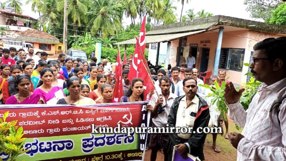 ಪ್ರತಿಭಟನೆಯನ್ನು ಉದ್ದೇಶಿಸಿ ಮಾತನಾಡಿದ ಕುಂದಾಪುರ ತಾಲೂಕು ಕಟ್ಟಡ ಮತ್ತು ಇತರೆ ನಿರ್ಮಾಣ ಕಾರ್ಮಿಕರ ಸಂಘದ ತಾಲೂಕು ಅಧ್ಯಕ್ಷ ಸುರೇಶ್ ಕಲ್ಲಾಗರ ಮಾತನಾಡಿ 2011 ರ ಜನಗಣತಿ ಪ್ರಕಾರ ಆಲೂರಿನಲ್ಲಿ 707 ಕುಟುಂಬಗಳಿದ್ದು 3584 ಜನಸಂಖ್ಯೆ ಹೊಂದಿರುವ ಗ್ರಾಮವಾಗಿದೆ ಅಲ್ಲದೇ ಸಾಕ್ಷರತೆಯಲ್ಲಿ ಹಿಂದುಳಿದ ಗ್ರಾಮವಾಗಿದೆ. ವಿದ್ಯಾರ್ಥಿ -ವಿದ್ಯಾರ್ಥಿನಿಯರಿಗೆ ಕಾಲೇಜುಗಳಿಗೆ ಹೋಗಿ ಬರಲು 22 ಕಿಮೀ ದೂರದಲ್ಲಿರುವ ಕುಂದಾಪುರ ಅಥವಾ ಬೈಂದೂರಿಗೆ 35ಕಿಮೀ ಕ್ರಮಿಸಬೇಕಾಗಿದೆ ಆದ್ದರಿಂದ ಜಿಲ್ಲಾಡಳಿತವು ಕೊಲ್ಲೂರು-ಆಲೂರು-ಕುಂದಾಪುರಕ್ಕೆ ಸರಕಾರಿ ಬಸ್ಸುಗಳನ್ನು ಆರಂಭಿಸಿದರೆ ಗ್ರಾಮದ ಜನರಿಗೆ ಅನುಕೂಲವಾಗಲಿದೆ ಎಂದು ಹೇಳಿದರು.