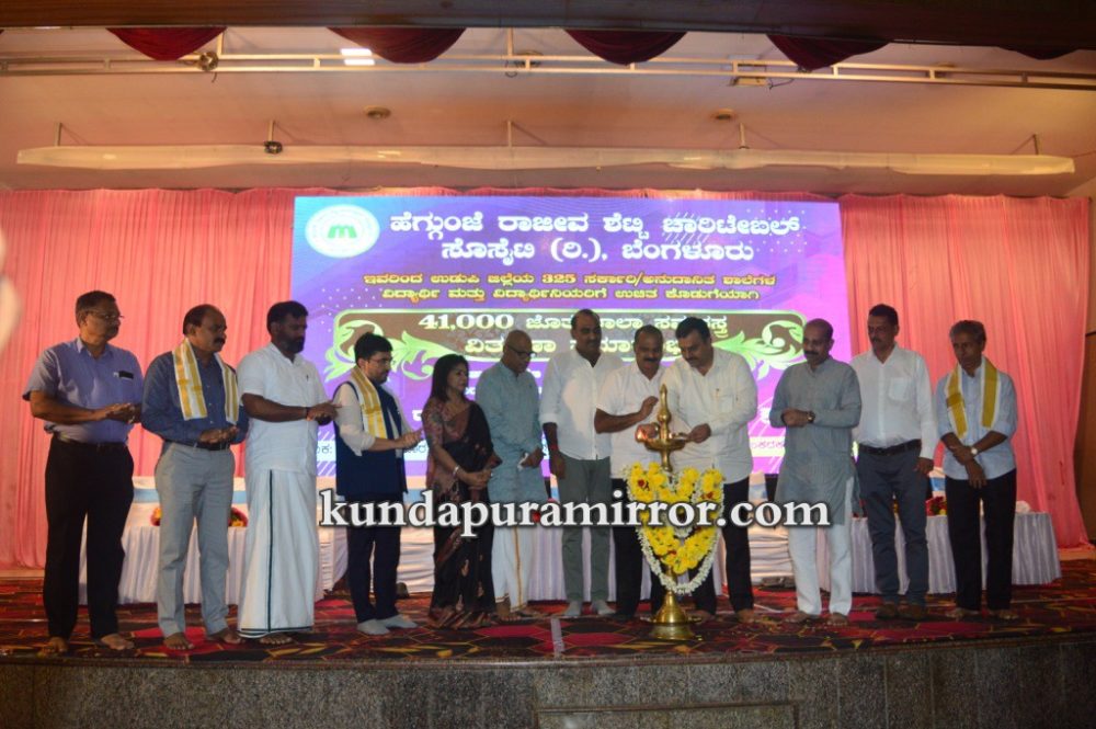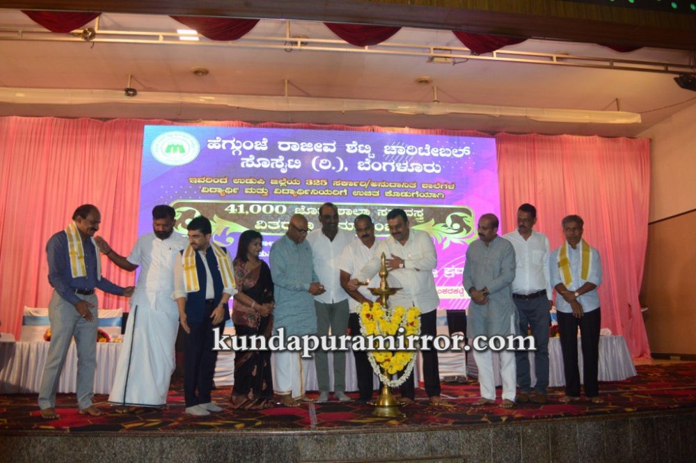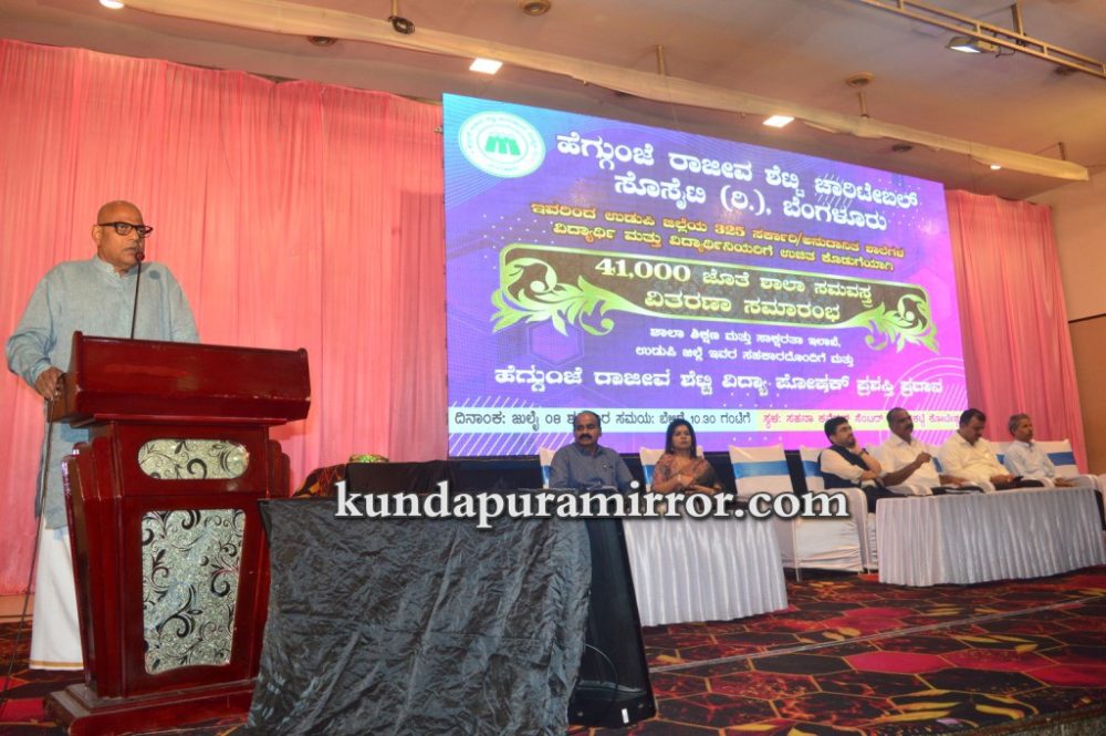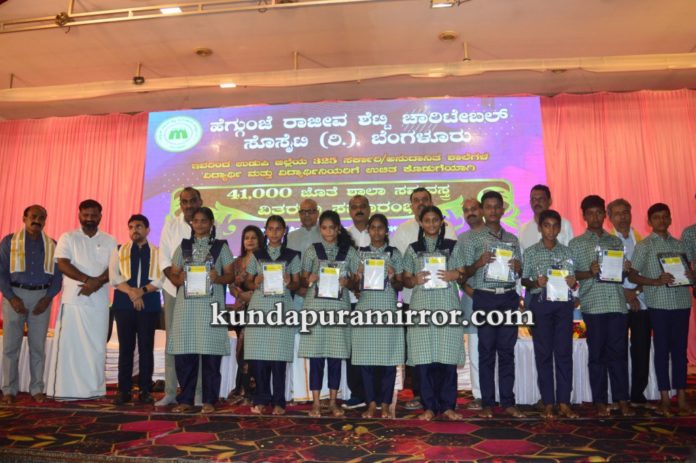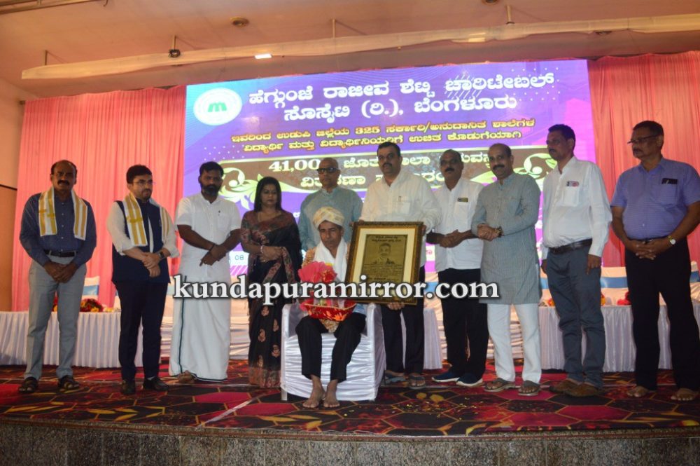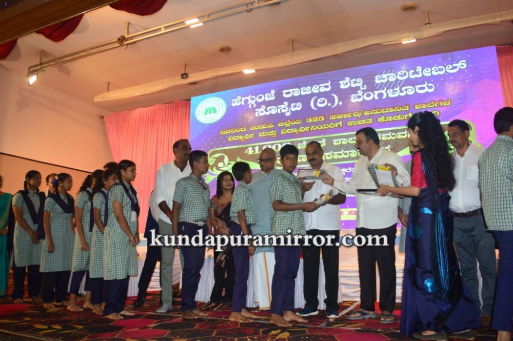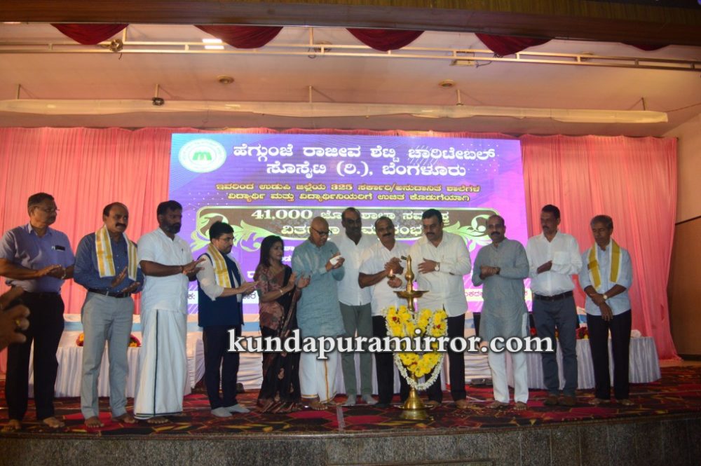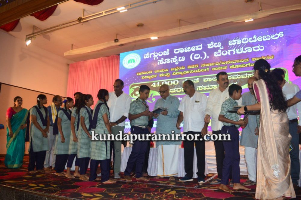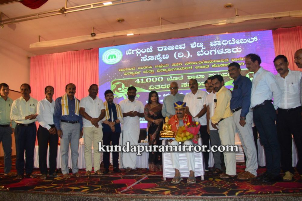 ಕುಂದಾಪುರ :ಹೆಗ್ಗುಂಜೆ ರಾಜೀವ ಶೆಟ್ಟಿ ಚಾರಿಟೆಬಲ್ ಸೊಸೈಟಿ ರಿ., ಬೆಂಗಳೂರು ಇವರು ಉಡುಪಿ ಜಿಲ್ಲೆಯ ೩೨೫ ಸರ್ಕಾರಿ, ಅನುದಾನಿತ ಶಾಲೆಗಳ ವಿದ್ಯಾರ್ಥಿ ಮತ್ತು ವಿದ್ಯಾರ್ಥಿನಿಯರಿಗೆ ಉಚಿತ ಕೊಡುಗೆಯಾಗಿ ೪೧,೦೦೦ ಜೊತೆ ಶಾಲಾ ಸಮವಸ್ತ್ರಗಳ ವಿತರಣೆ ಕಾರ್ಯಕ್ರಮ ಶಾಲಾ ಶಿಕ್ಷಣ ಮತ್ತು ಸಾಕ್ಷರತಾ ಇಲಾಖೆ, ಉಡುಪಿ ಜಿಲ್ಲೆ ಇವರ ಸಹಕಾರದೊಂದಿಗೆ ಮತ್ತು ಹೆಗ್ಗುಂಜೆ ರಾಜೀವ ಶೆಟ್ಟಿ ವಿದ್ಯಾ ಪೋಷಕ್ ಪ್ರಶಸ್ತಿ ಪ್ರದಾನ ಕಾರ್ಯಕ್ರಮ ಜುಲೈ ೮ ಶನಿವಾರ ಕುಂದಾಪುರ ಅಂಕದಕಟ್ಟೆಯ ಸಹನಾ ಕನ್ವನ್ಷನ್ ಸೆಂಟರ್ನಲ್ಲಿ ನಡೆಯಿತು.