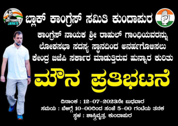 ಕುಂದಾಪುರ: ಬಿಜೆಪಿಯ ಕುಟಿಲ ರಾಜನೀತಿ ಹಾಗೂ ರಾಹುಲ್ ಗಾಂಧಿಯವರ ತೇಜೋವಧೆ ನಡೆಸುತ್ತಿರುವುದರ ವಿರುದ್ಧ ನಾಳೆ ಕುಂದಾಪುರದಲ್ಲಿ ಕಾಂಗ್ರೆಸ್ ಮೌನ ಪ್ರತಿಭಟನೆ ನಡೆಸಲಿದೆ.