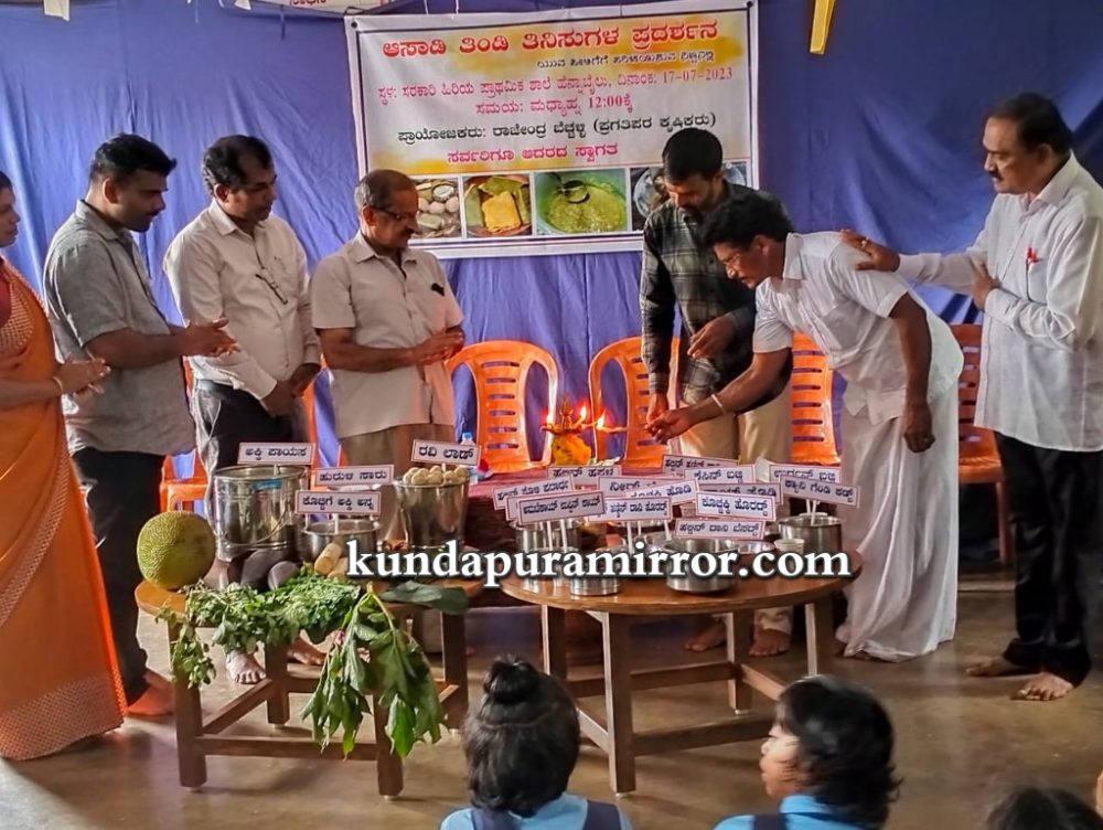 ಕುಂದಾಪುರ :ಹೆನ್ನಾಬೈಲ್ ಸರ್ಕಾರಿ ಹಿ.ಪ್ರಾ ಶಾಲೆಯಲ್ಲಿ ಪ್ರಗತಿಪರ ಕೃಷಿಕ ರಾಜೇಂದ್ರ ಬೆಚ್ಚಳ್ಳಿ ಪ್ರಾಯೋಜಕತ್ವದಲ್ಲಿ ಯುವ ಪೀಳಿಗೆಗೆ ಪರಿಚಯಿಸುವ ನಿಟ್ಟಿನಲ್ಲಿ ಹಳೆ ಕಾಲದ ಹತ್ತಾರು ಬಗೆಯ ಆಷಾಡಾ ತಿಂಡಿ ತಿನಿಸುಗಳ ಪ್ರದರ್ಶನ ನಡೆಯಿತು.