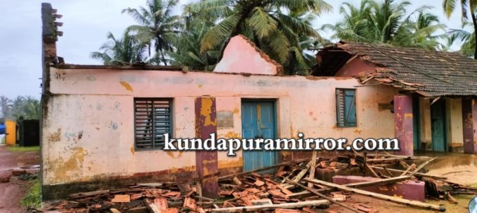 ಬೈಂದೂರು :ಕರಾವಳಿಯಲ್ಲಿ ಬೀಸುತ್ತಿರುವ ಭಾರೀ ಗಾಳಿ ಹಾಗೂ ಸುರಿಯುತ್ತಿರುವ ಮಳೆಗೆ ಕಳೆದ ಮೂರು ದಿನಗಳಿಂದ ಜಿಲ್ಲಾಡಳಿತ ರಜೆ ಘೋಷಣೆ ಮಾಡಿದೆ. ಆದರೆ ಬೈಂದೂರು ತಾಲೂಕಿನ ಪಡುವರಿ ಗ್ರಾಮ ಪಂಚಾಯತ್ ವ್ಯಾಪ್ತಿಯ ತಾರಾಪತಿ ಎಂಬಲ್ಲಿರುವ ಹಿರಿಯ ಪ್ರಾಥಮಿಕ ಶಾಲೆಯ ಕಟ್ಟಡವೊಂದು ಗುರುವಾರ ನಸುಕಿನಲ್ಲಿ ಕುಸಿದು ಬಿದ್ದಿದೆ.