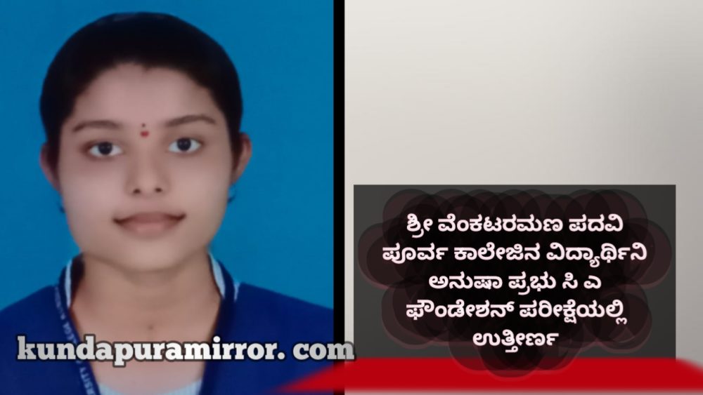 ಕುಂದಾಪುರ : 2023 ರ ಜೂನ್ ನಲ್ಲಿ ನಡೆದ ಸಿ ಎ ಫೌಂಡೇಶನ್ ಪರೀಕ್ಷೆಯಲ್ಲಿ ಶ್ರೀ ವೆಂಕಟರಮಣ ಪದವಿ ಪೂರ್ವ ಕಾಲೇಜಿನ ವಿದ್ಯಾರ್ಥಿನಿ ಅನುಷಾ ಪ್ರಭು ಉತ್ತೀರ್ಣರಾಗಿದ್ದಾರೆ.