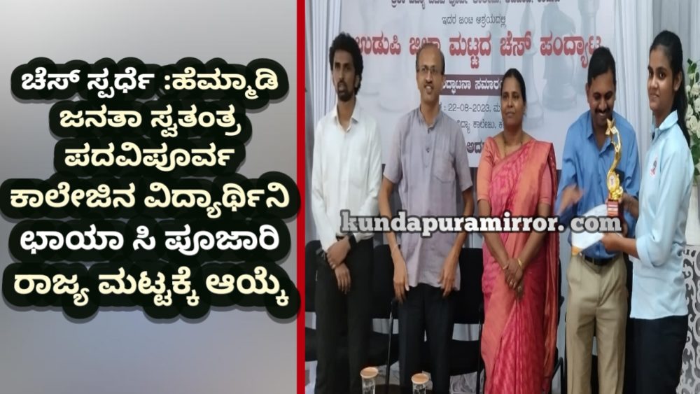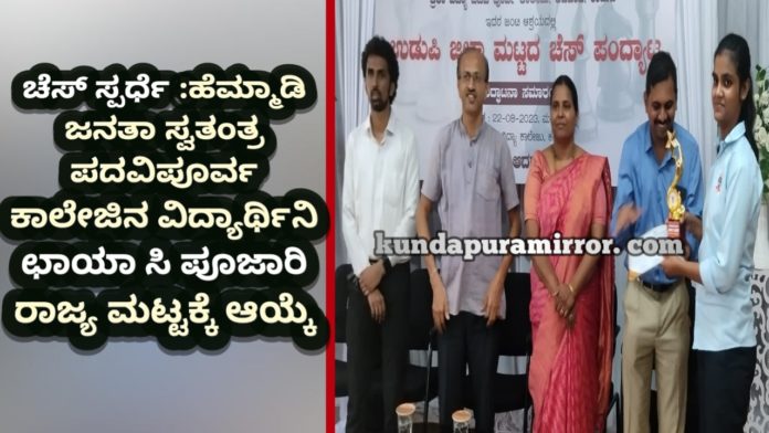 ಕುಂದಾಪುರ :ಪದವಿಪೂರ್ವ ಶಿಕ್ಷಣ ಇಲಾಖೆಯವರು ತ್ರಿಷಾ ಪದವಿಪೂರ್ವ ಕಾಲೇಜು ಉಡುಪಿಯಲ್ಲಿ ಆಯೋಜಿಸಿದ ಜಿಲ್ಲಾ ಮಟ್ಟದ ಚದುರಂಗ (ಚೆಸ್) ಸ್ಪರ್ಧೆಯಲ್ಲಿ ವಿಜೇತಳಾದ ಹೆಮ್ಮಾಡಿಯ ಜನತಾ ಸ್ವತಂತ್ರ ಪದವಿಪೂರ್ವ ಕಾಲೇಜಿನ ದ್ವಿತೀಯ ಪಿ.ಯು.ಸಿ.ವಿಜ್ಞಾನ ವಿಭಾಗದ ವಿದ್ಯಾರ್ಥಿನಿ ಛಾಯಾ ಸಿ.ಪೂಜಾರಿ ರಾಜ್ಯ ಮಟ್ಟದ ಸ್ಪರ್ಧೆಗೆ ಆಯ್ಕೆಯಾಗಿರುತ್ತಾಳೆ.