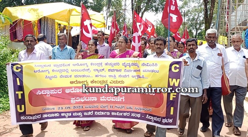 ಕುಂದಾಪುರ: ಸಿದ್ದಾಪುರ ಪ್ರಾಥಮಿಕ ಆರೋಗ್ಯ ಕೇಂದ್ರವನ್ನು ಸರಕಾರ ಮೇಲ್ದರ್ಜೆಗೆ ಏರಿಸಲು ಆಗ್ರಹಿಸಿ ಸಿದ್ದಾಪುರ ಪೇಟೆಯಿಂದ ಪ್ರಾಥಮಿಕ ಆರೋಗ್ಯ ಕೇಂದ್ರ ವರೆಗೆ ಕಟ್ಟಡ ಹಾಗೂ ಗೇರು ಬೀಜ ಕಾರ್ಖಾನೆ ಕಾರ್ಮಿಕರು ಹಾಗೂ ಗ್ರಾಮಸ್ಥರು ಮೆರವಣಿಗೆ ನಡೆಸಿ ಆರೋಗ್ಯ ಕೇಂದ್ರದ ಎದುರುಗಡೆ ಬೆಳಿಗ್ಗೆ ಪ್ರತಿಭಟನಾ ಧರಣಿ ನಡೆಸಿದರು.