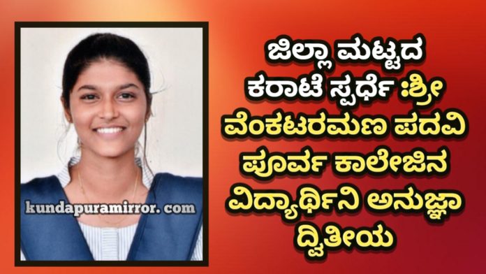 ಕುಂದಾಪುರ : ಉಡುಪಿ ಜಿಲ್ಲಾ ಪದವಿ ಪೂರ್ವ ಶಿಕ್ಷಣ ಇಲಾಖೆ ಹಾಗೂ ಶ್ಯಾಮಿಲಿ ಪದವಿ ಪೂರ್ವ ಕಾಲೇಜು ಉಡುಪಿ ಇವರ ಜಂಟಿ ಆಶ್ರಯದಲ್ಲಿ ನಡೆದ ಕರಾಟೆ ಸ್ಪರ್ಧೆಯಲ್ಲಿ ಶ್ರೀ ವೆಂಕಟರಮಣ ಪದವಿ ಪೂರ್ವ ಕಾಲೇಜಿನ ವಿದ್ಯಾರ್ಥಿನಿ – 60 ಕೆ. ಜಿ ವಿಭಾಗದಲ್ಲಿ ದ್ವಿತೀಯ ಸ್ಥಾನ ಪಡೆದಿದ್ದಾಳೆ.