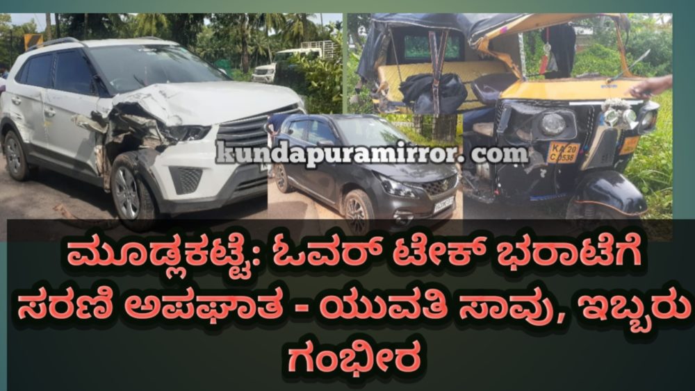 ಮೂಡ್ಲಕಟ್ಟೆ ಸಮೀಪ ಬರುತ್ತಿದ್ದಂತೆ ಬಸ್ರೂರು ಕಡೆಯಿಯಿಂದ ಬರುತ್ತಿದ್ದ ವಸಂತ ಪೂಜಾರಿ ಎಂಬಾತ ಎದುರಿನಿಂದ ಹೋಗುತ್ತಿದ್ದ ಇನ್ನೊಂದು ಕಾರನ್ನು ಓವರ್ ಟೇಕ್ ಮಾಡುತ್ತಿದ್ದ ವೇಳೆ ಎದುರಿನಿಂದ ಆಟೋರಿಕ್ಷಾಕ್ಕೆ ಡಿಕ್ಕಿ ಹೊಡೆದಿದೆ. ಢಕ್ಕಿ ರಭಸಕ್ಕೆ ಆಟೋ ರಿಕ್ಷಾ ಎದುರಿದ್ದ ಕಾರಿನ ಮೇಲೆ ಪಲ್ಟಿಯಾಗಿದೆ. ಪರಿಣಾಮ ರಿಕ್ಷಾದಲ್ಲಿದ್ದ ಅಂಬಿಕಾ ಗಂಭೀರ ಗಾಯಗೊಂಡು ಸಾವನ್ನಪ್ಪಿದ್ದಾರೆ. ರಿಕ್ಷಾದಲ್ಲಿದ್ದ ಶಾಂತಾರಾಮ್ ಹಾಗೂ ನಯನ್ ಕುಮಾರ್ ಗಂಭೀರ ಗಾಯಗೊಂಡು ಆಸ್ಪತ್ರೆಗೆ ದಾಖಲಾಗಿದ್ದಾರೆ. ಕುಂದಾಪುರ ಸಂಚಾರಿ ಪೊಲೀಸ್ ಠಾಣೆಯಲ್ಲಿ ಪ್ರಕರಣ ದಾಖಲಾಗಿದೆ.