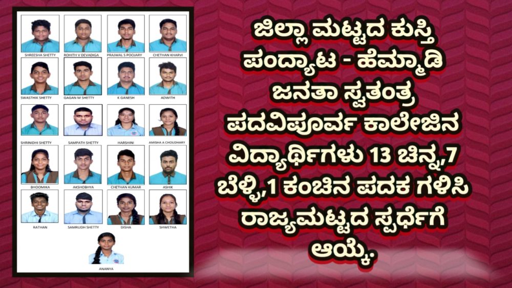 ಹೆಮ್ಮಾಡಿ :ಉಡುಪಿ ಜಿಲ್ಲಾ ಪದವಿಪೂರ್ವ ಶಿಕ್ಷಣ ಉಲಾಖೆಯವರು ಕೊಲ್ಲೂರು ಶ್ರೀ ಮೂಕಾಂಬಿಕಾ ದೇವಳದ ಸ್ವತಂತ್ರ ಪದವಿಪೂರ್ವ ಕಾಲೇಜಿನಲ್ಲಿ ಆಯೋಜಿಸಿದ ಜಿಲ್ಲಾ ಮಟ್ಟದ ಕುಸ್ತಿ ಪಂದ್ಯಾಟದಲ್ಲಿ ಜನತಾ ಸ್ವತಂತ್ರ ಪದವಿಪೂರ್ವ ಕಾಲೇಜಿನ ವಿದ್ಯಾರ್ಥಿಗಳಾದ