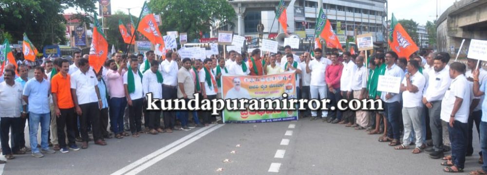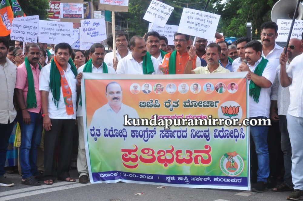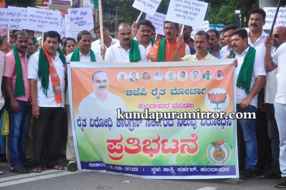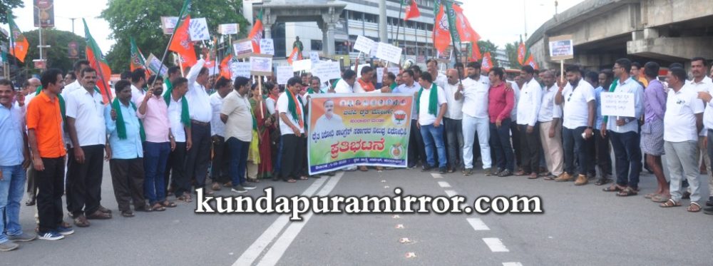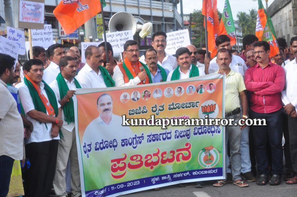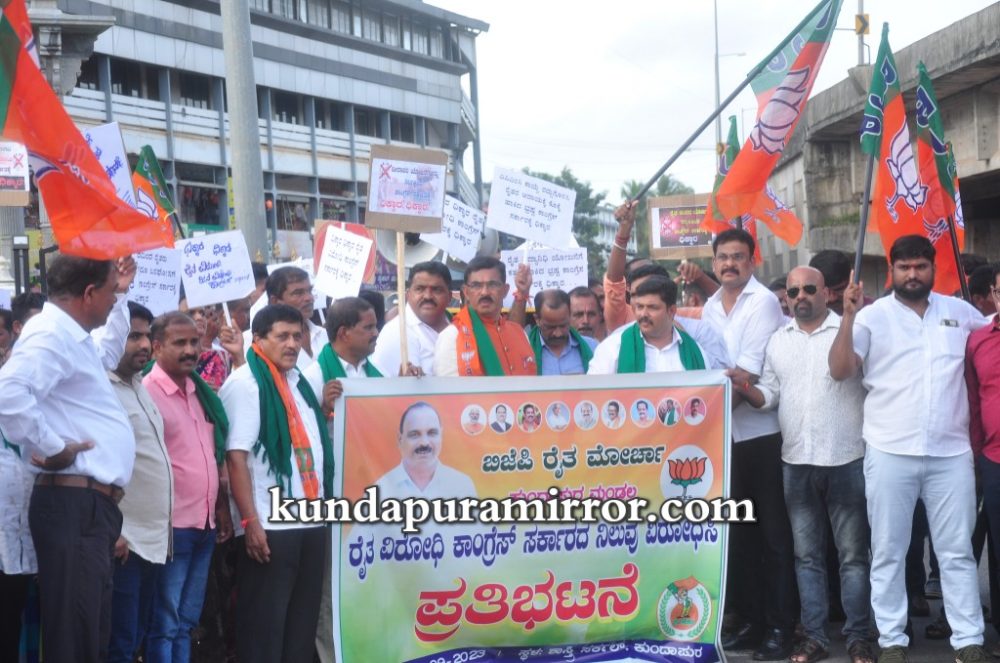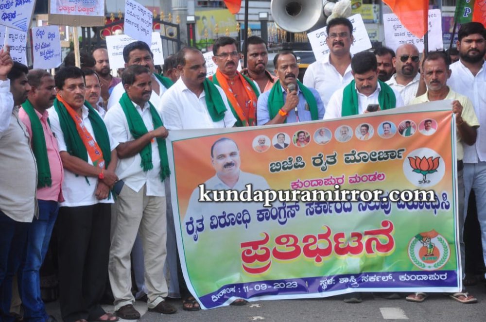 ಸೋಮವಾರ ಸಂಜೆ ಇಲ್ಲಿನ ಶಾಸ್ತ್ರೀವೃತ್ತದಲ್ಲಿ ರಾಜ್ಯ ಸರಕಾರದ ರೈತ ವಿರೋಧಿ ನಿಲುವು ಖಂಡಿಸಿ ಬಿಜೆಪಿ ರೈತ ಮೋರ್ಚಾ ಕುಂದಾಪುರ ಮಂಡಲ ಹಮ್ಮಿಕೊಂಡ ಪ್ರತಿಭಟನೆಯಲ್ಲಿ ಅವರು ಮಾತನಾಡಿದರು.