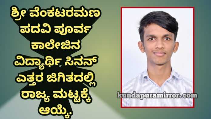 ಕುಂದಾಪುರ :ಉಡುಪಿ ಜಿಲ್ಲಾ ಅಮೆಚೂರ್ ಅಸೋಸಿಯೇಶನ್ ಅವರು 18 ವರ್ಷದೊಳಗಿನವರಿಗಾಗಿ ಆಯೋಜಿಸಿದ ಜಿಲ್ಲಾ ಮಟ್ಟದ ಎತ್ತರ ಜಿಗಿತ ಸ್ಪರ್ಧೆಯಲ್ಲಿ ಶ್ರೀ ವೆಂಕಟರಮಣ ಪದವಿ ಪೂರ್ವ ಕಾಲೇಜಿನ ಪ್ರಥಮ ಪಿಯುಸಿ ವಿಜ್ಞಾನ ವಿಭಾಗದ ವಿದ್ಯಾರ್ಥಿ ಸಿನನ್ ಪ್ರಥಮ ಸ್ಥಾನವನ್ನು ಪಡೆದು ರಾಜ್ಯ ಮಟ್ಟಕ್ಕೆ ಆಯ್ಕೆಯಾಗಿದ್ದಾರೆ.