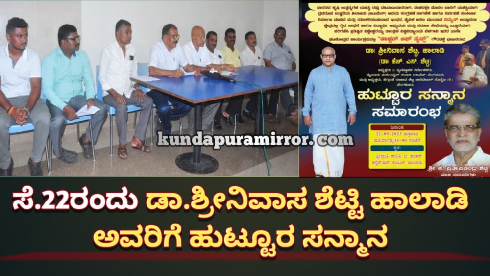 ಕುಂದಾಪುರ :ಮೈಸೂರು ಮರ್ಕಂಟೈಲ್ ಕಂಪನಿ ಅಧ್ಯಕ್ಷರು ಮತ್ತು ಹೆಗ್ಗುಂಜೆ ರಾಜೀವ ಶೆಟ್ಟಿ ಚಾರಿಟೇಬಲ್ ಸೊಸೈಟಿ ಬೆಂಗಳೂರು ಇದರ ಅಧ್ಯಕ್ಷರಾಗಿರುವ ಡಾ.ಶ್ರೀನಿವಾಸ ಶೆಟ್ಟಿ ಹಾಲಾಡಿ (ಎಚ್.ಎಸ್.ಶೆಟ್ಟಿ) ಇವರಿಗೆ ಪ್ರತಿಷ್ಟಿತ ವಿಶ್ವೇಶ್ವರಯ್ಯ ತಾಂತ್ರಿಕ ವಿಶ್ವವಿದ್ಯಾಲಯ ಬೆಳಗಾವಿ ಇವರು 23ನೇ ಘಟಿಕೋತ್ಸವ ಸಂದರ್ಭದಲ್ಲಿ ಗೌರವ ಡಾಕ್ಟರ್ ಆಫ್ ಸೈನ್ಸ್ ಗೌರವವನ್ನು ನೀಡಿ ಗೌರವಿಸಿದೆ. ಆ ಹಿನ್ನೆಲೆಯಲ್ಲಿ ಹುಟ್ಟೂರಿನಲ್ಲಿ ಡಾ.ಶ್ರೀನಿವಾಸ ಶೆಟ್ಟಿ ಹಾಲಾಡಿ ಅವರನ್ನು ಸನ್ಮಾನಿಸುವ ಕಾರ್ಯಕ್ರಮವನ್ನು ಸೆ.22 ಶುಕ್ರವಾರ, ಪೂರ್ವಾಹ್ನ 11 ಗಂಟೆಗೆ ಹಾಲಾಡಿಯ ಶ್ರೀಮತಿ ಶಾಲಿನಿ ಜಿ.ಶಂಕರ್ ಕನ್ವೆಶನ್ ಸೆಂಟರ್ನಲ್ಲಿ ಆಯೋಜಿಸಲಾಗಿದೆ ಎಂದು ಡಾ.ಶ್ರೀನಿವಾಸ ಶೆಟ್ಟಿ ಹಾಲಾಡಿ ಹುಟ್ಟೂರ ಸನ್ಮಾನ ಸಮಿತಿ ಅಧ್ಯಕ್ಷರಾದ ಸರ್ವೋತ್ತಮ ಶೆಟ್ಟಿ ಹೇಳಿದರು.