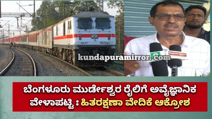 ಕುಂದಾಪುರ: ಇತ್ತೀಚೆಗೆ ಮುರುಡೇಶ್ವರದ ವರೆಗೆ ವಿಸ್ತರಣೆಗೊಂಡ ಬೆಂಗಳೂರು ಮೈಸೂರು ಮಂಗಳೂರು ಮುರ್ಡೇಶ್ವರ (16585) ರೈಲಿನ ವೇಳಾಪಟ್ಟಿಯ ವಿರುದ್ಧ ರೈಲು ಪ್ರಯಾಣಿಕರ ಹಿತರಕ್ಷಣಾ ಸಮಿತಿ ಅಧ್ಯಕ್ಷ ಗಣೇಶ್ ಪುತ್ರನ್ ಆಕ್ರೋಶ ವ್ಯಕ್ತ ಪಡಿಸಿದ್ದಾರೆ.