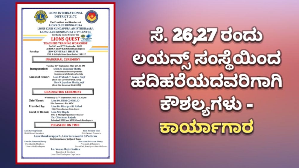 ಕುಂದಾಪುರ :ಲಯನ್ಸ್ ಜಿಲ್ಲೆ 317Cನ ಲಯನ್ಸ್ ಕ್ಲಬ್ ಕುಂದಾಪುರ, ಲಯನ್ಸ್ ಕ್ಲಬ್ ಕುಂದಾಪುರ ಅಮೃತಧಾರ ಹಾಗೂ ಲಯನ್ಸ್ ಕ್ಲಬ್ ಸಿಟಿ ಸೆಂಟರ್ನ ಸಂಯುಕ್ತ ಆಶ್ರಯದಲ್ಲಿ ಲಯನ್ಸ್ ಇಂಟರ್ನ್ಯಾಷನಲ್ ಫೌಂಡೇಶನ್ನ ಕಾರ್ಯಕ್ರಮವಾದ ಲಯನ್ಸ್ ಕ್ವೆಸ್ಟ್ ಕಾರ್ಯಕ್ರಮದಡಿಯಲ್ಲಿ ಹದಿಹರೆಯದವರಿಗಾಗಿ ಕೌಶಲ್ಯಗಳ ಕುರಿತು ಶಿಕ್ಷಕರಿಗೆ ತರಬೇತಿ ಕಾರ್ಯಾಗಾರವನ್ನು ಏರ್ಪಡಿಸಲಾಗಿದೆ. ಇದೇ ತಿಂಗಳ 26,27ರಂದು ಕುಂದಾಪುರ ಎಜುಕೇಷನ್ ಸೊಸೈಟಿಯ ಅಧೀನ ಶಿಕ್ಷಣ ಸಂಸ್ಥೆಗಳಾದ ಎಚ್ಎಮ್ಎಮ್ ಮತ್ತು ವಿಕೆ ಆರ್ ಶಾಲೆ ಕುಂದಾಪುರದಲ್ಲಿ ನಡೆಯಲಿದೆ.