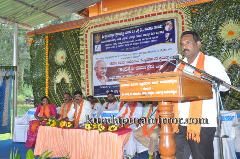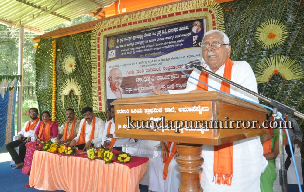 ಅವರು ಸೋಮವಾರ ಅಮಾಸಬೈಲು ಶ್ರೀ ಬ್ರಹ್ಮಬೈದರ್ಕಳ ಗರಡಿ ವಠಾರದಲ್ಲಿ ನಡೆದ ಶ್ರೀ ಕ್ಷೇತ್ರ ಧರ್ಮಸ್ಥಳ ಗ್ರಾಮಾಭಿವೃದ್ಧಿ ಯೋಜನೆ ಬಿ.ಸಿ. ಟ್ರಸ್ಟ್ (ರಿ.) ಕುಂದಾಪುರ, ಅಖಿಲ ಕರ್ನಾಟಕ ಜನಜಾಗೃತಿ ವೇದಿಕೆ ಟ್ರಸ್ಟ್(ರಿ.) ಧರ್ಮಸ್ಥಳ, ತಾಲೂಕು ಜನಜಾಗೃತಿ ವೇದಿಕೆ ಕುಂದಾಪುರ, ಕರ್ನಾಟಕ ರಾಜ್ಯ ಮದ್ಯಪಾನ ಸಂಯಮ ಮಂಡಳಿ ಬೆಂಗಳೂರು ಹಾಗೂ ಪ್ರಗತಿ ಬಂಧು ಸ್ವ ಸಹಾಯ ಸಂಘಗಳ ಒಕ್ಕೂಟ ಅಮಾಸಬೈಲು ವಲಯ ಇವರ ಸಹಯೋಗದೊಂದಿಗೆ 152ನೇ ಗಾಂಧಿ ಜಯಂತಿಯ ಸಂಭ್ರಮಾಚರಣೆ ಪ್ರಯುಕ್ತ ಗಾಂಧಿಸ್ಮೃತಿ ಕಾರ್ಯಕ್ರಮ ಹಾಗೂ ದುಶ್ಚಟ ಮುಕ್ತ ಸಮಾಜಕ್ಕಾಗಿ ವ್ಯಸನ ಮುಕ್ತ ಸಾಧಕರ ಸಮಾವೇಶ ಉದ್ಘಾಟಿಸಿ ಮಾತನಾಡಿದರು.