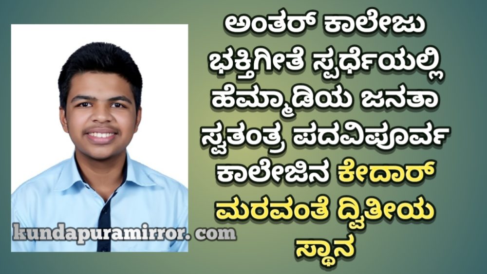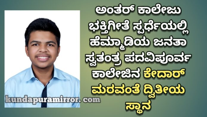ಹೆಮ್ಮಾಡಿ: ಶ್ರೀ ಶಾರದಾ ಪದವಿಪೂರ್ವ ಕಾಲೇಜು ಬಸ್ರೂರು ಇವರು ಆಯೋಜಿಸಿದ ಅಂತರ್ ಕಾಲೇಜು ಭಕ್ತಿಗೀತೆ ಸ್ಪರ್ಧೆಯಲ್ಲಿ ಹೆಮ್ಮಾಡಿ ಜನತಾ ಸ್ವತಂತ್ರ ಪದವಿಪೂರ್ವ ಕಾಲೇಜಿನ ಪ್ರಥಮ ಪಿ.ಯು.ಸಿ.ವಿಜ್ಞಾನ ವಿಭಾಗದ ಕೇದಾರ್ ಮರವಂತೆ ಭಾಗವಹಿಸಿ ದ್ವಿತೀಯ ಸ್ಥಾನ ಪಡೆದಿರುತ್ತಾನೆ.