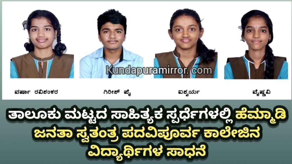 ಹೆಮ್ಮಾಡಿ: ಉಡುಪಿ ಜಿಲ್ಲಾ ಪ್ರವಾಸೋದ್ಯಮ ಇಲಾಖೆಯವರು ವಿಶ್ವ ಪ್ರವಾಸೋದ್ಯಮ ದಿನದ ಅಂಗವಾಗಿ ಆಯೋಜಿಸಿದ ತಾಲೂಕು ಮಟ್ಟದ ವಿವಿಧ ಸಾಹಿತ್ಯಕ ಸ್ಪರ್ಧೆಗಳಲ್ಲಿ ಜನತಾ ಸ್ವತಂತ್ರ ಪದವಿಪೂರ್ವ ಕಾಲೇಜಿನ ವಿದ್ಯಾರ್ಥಿಗಳು ಭಾಗವಹಿಸಿ ಹಲವು ವಿಭಾಗಗಳಲ್ಲಿ ಸಾಧನೆ ಮೆರೆದಿದ್ದಾರೆ.