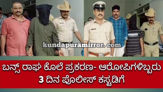 ಕುಂದಾಪರ : ಚಿಕ್ಕಮ್ಮನಸಾಲು ರಸ್ತೆಯಲ್ಲಿ ಭಾನುವಾರದಂದು ಸಂಜೆ ಚೂರಿ ಇರಿತದಿಂದ ಮೃತರಾಗಿದ್ದ ರಾಘವೇಂದ್ರ ಶೇರುಗಾರ್ ಅಲಿಯಾಸ್ ಬನ್ಸ್ ರಾಘ ಪ್ರಕರಣಕ್ಕೆ ಸಂಬಂಧಿಸಿದಂತೆ ಶಿವಮೊಗ್ಗ ಮೂಲದ ಇಬ್ಬರು ಆರೋಪಿಗಳನ್ನು ಪೊಲೀಸರು ಬೆಂಗಳೂರಿನಲ್ಲಿ ಬಂಧಿಸಿ ಕುಂದಾಪುರದ ನ್ಯಾಯಾಲಕ್ಕೆ ಹಾಜರುಪಡಿಸಿದ್ದಾರೆ.