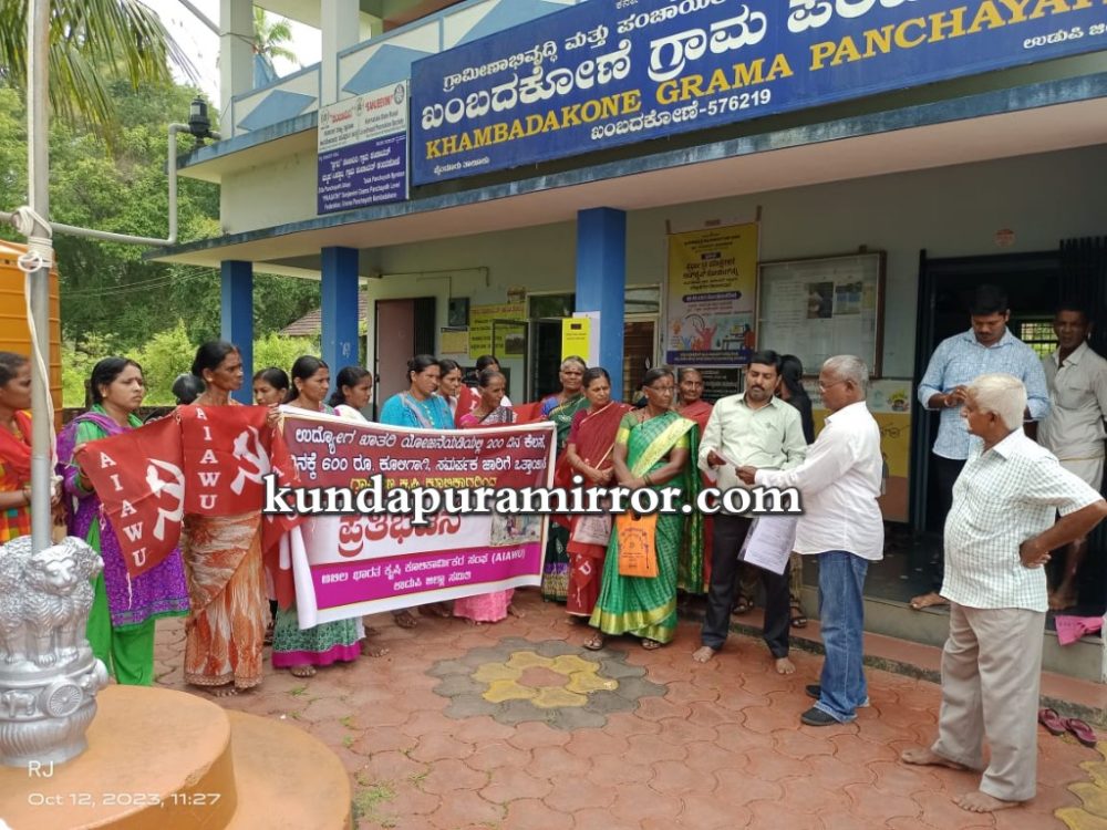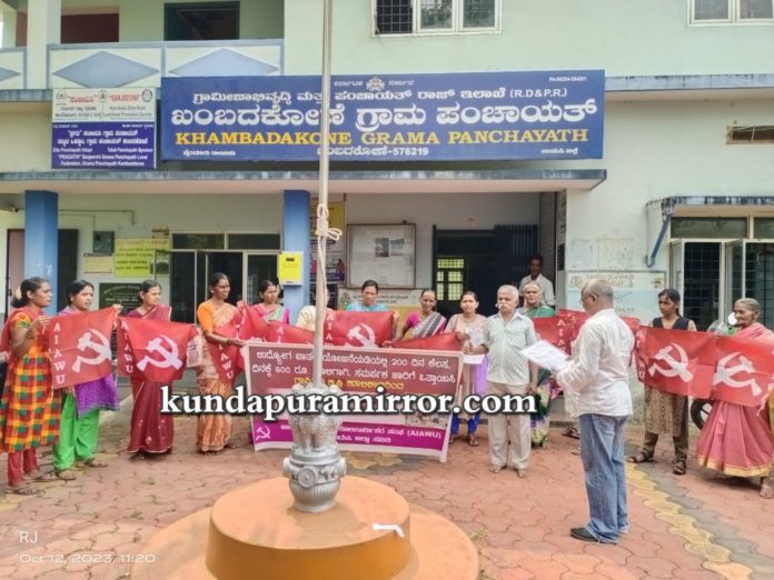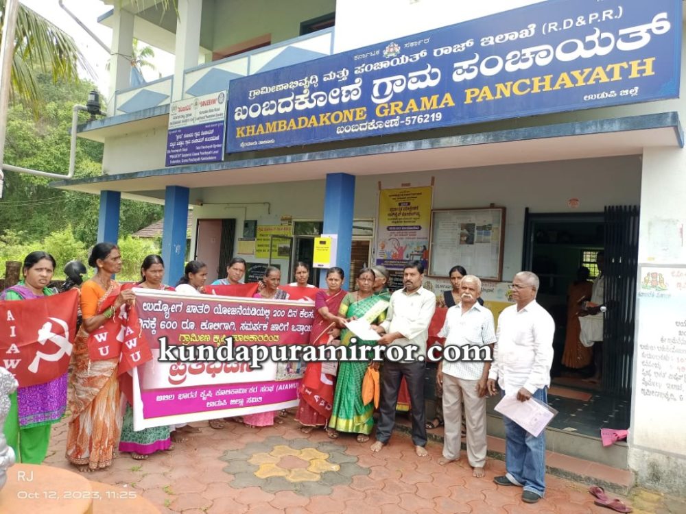 ಉಡುಪಿ ಜಿಲ್ಲೆಯ ಬೈಂದೂರು ತಾಲೂಕು ಖಂಬದಕೋಣೆ ಗ್ರಾಮ ಪಂಚಾಯತ್ ಕಚೇರಿ ಎದುರು ಕೃಷಿ ಕೂಲಿಕಾರರ ಪ್ರತಿಭಟನೆ ಯಶಸ್ವಿಯಾಗಿ ಜರುಗಿತು.