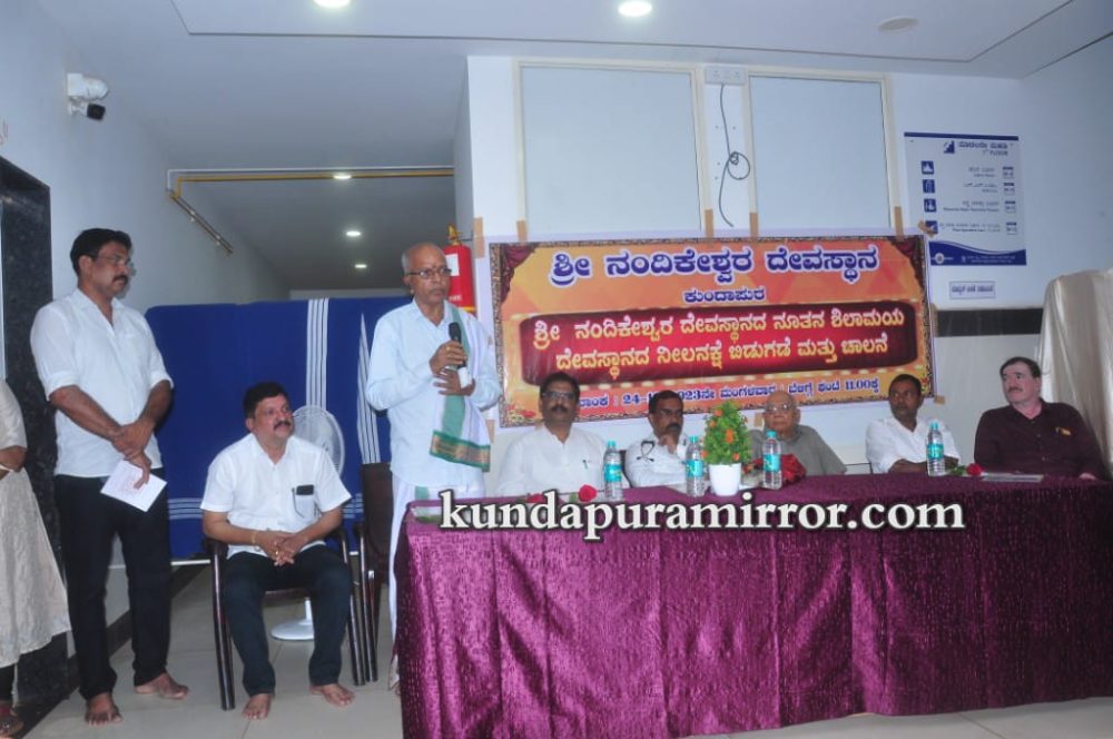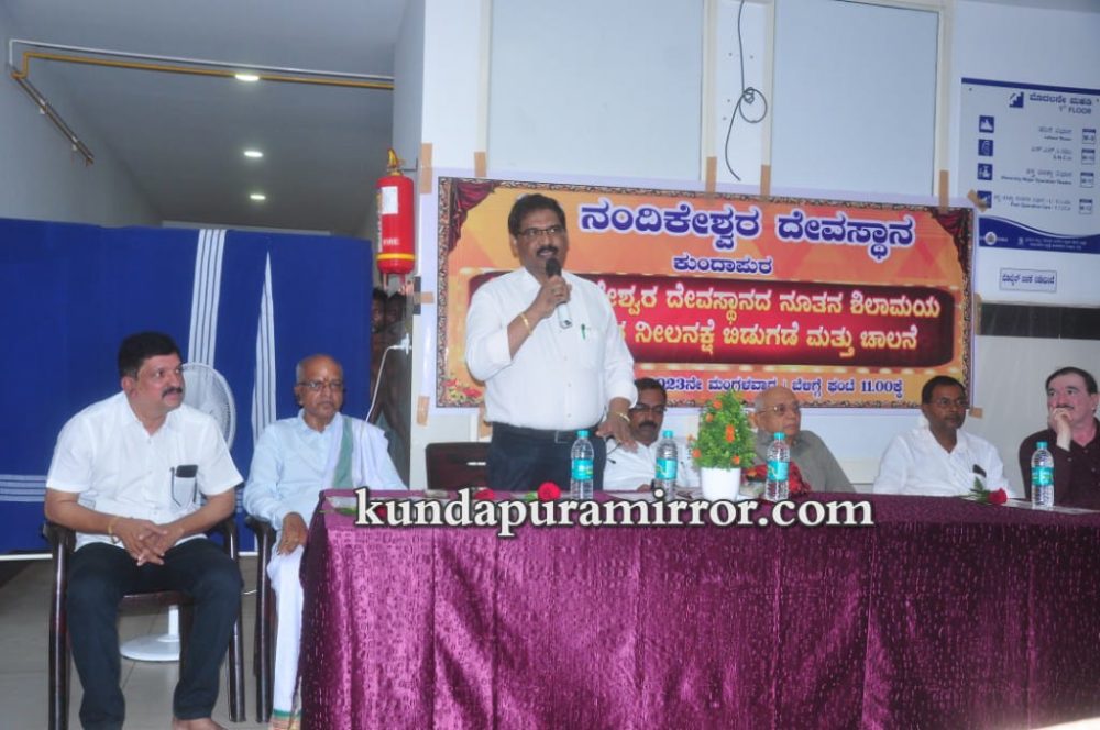 ಶಿಲ್ಪಿಗಳಿಗೆ ಕಾಮಗಾರಿ ಆರಂಭಿಸಲು ವೀಳ್ಯ ನೀಡಿದ ಕುಂದಾಪುರದ ಶ್ರೀ ಮೈಲಾರೇಶ್ವರ ದೇವಸ್ಥಾನದ ವ್ಯವಸ್ಥಾಪನಾ ಸಮಿತಿ ಅಧ್ಯಕ್ಷರಾದ ಕೆ.ರಮೇಶ ಬಿಲ್ಲವ ಮೈಲಾರೇಶ್ವರ ದೇವಸ್ಥಾನಕ್ಕೂ ಈ ನಂದಿಕೇಶ್ವರ ದೇವಸ್ಥಾನಕ್ಕೂ ಸಂಬಂಧವಿರುವುದು ಹಿಂದೆ ಅಷ್ಟಮಂಗಲ ಪ್ರಶ್ನಾ ಚಿಂತನೆಯಲ್ಲಿ ವ್ಯಕ್ತವಾಗಿತ್ತು. ಈಗ ಇಲ್ಲಿ ಸ್ವರ್ಣರೂಢ ಪ್ರಶ್ನೆ ಇರಿಸಿದಾಗಲೂ ಕೂಡಾ ಇದು ದೃಢಪಟ್ಟಿದೆ. ನಿರೀಕ್ಷಿತ ಸಮಯದಲ್ಲಿ ದೇವಸ್ಥಾನ ನಿರ್ಮಾಣವಾಗಲಿ ಎಂದರು.
