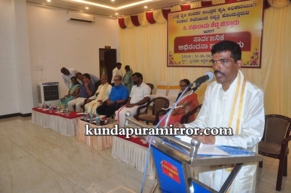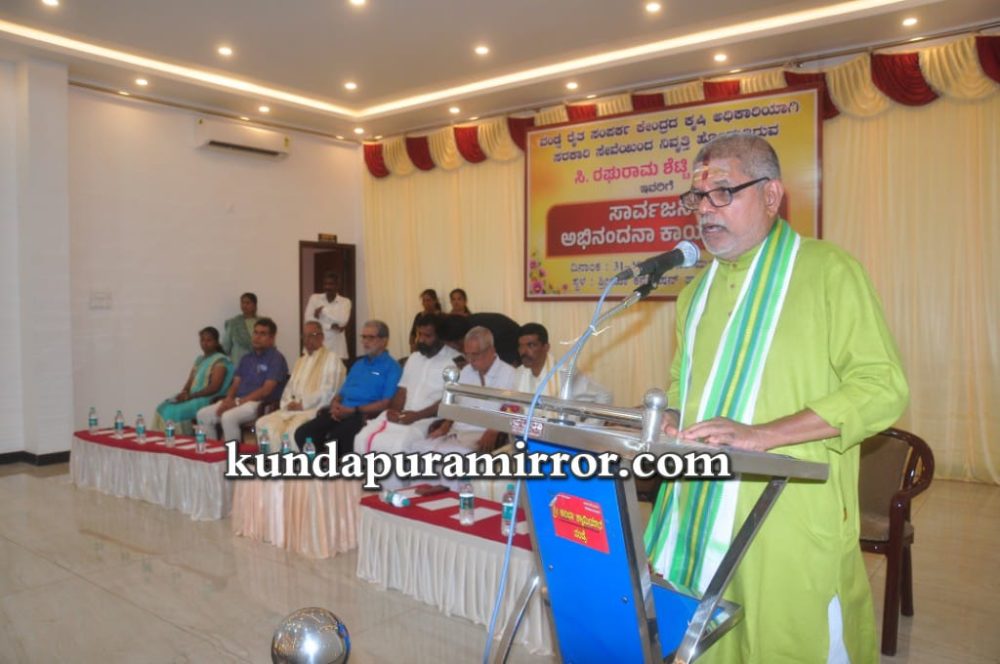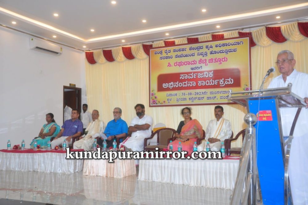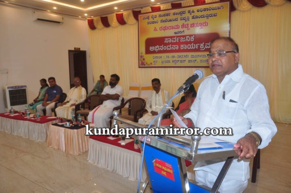 ಅವರು ವಂಡ್ಸೆ ಶ್ರೀಯಾ ಕನ್ವನ್ಷನ್ ಹಾಲ್ನಲ್ಲಿ ವಂಡ್ಸೆ ರೈತ ಸಂಪರ್ಕ ಕೇಂದ್ರದ ಕೃಷಿ ಅಧಿಕಾರಿಯಾಗಿ ಸೇವೆ ಸಲ್ಲಿಸಿ ಅ.31ರಂದು ನಿವೃತ್ತರಾದ ಸಿ. ಅಧಿಕಾರಿ ರಘುರಾಮ ಶೆಟ್ಟಿ ಚಿತ್ತೂರು ಇವರನ್ನು ಸಾರ್ವಜನಿಕರ ಅಭಿನಂದನಾ ಸಮಿತಿ ವಂಡ್ಸೆ ಹೋಬಳಿಯ ವತಿಯಿಂದ ಜರುಗಿದ ಸಾರ್ವಜನಿಕ ಅಭಿನಂದನಾ ಕಾರ್ಯಕ್ರಮದಲ್ಲಿ ಭಾಗವಹಿಸಿ ಮಾತನಾಡಿದರು.