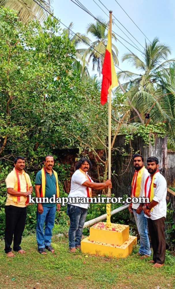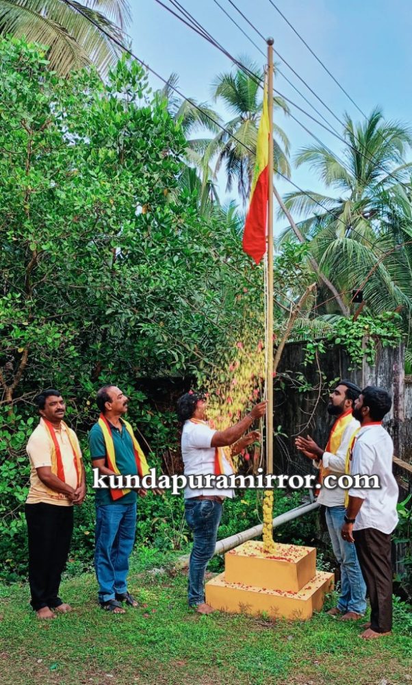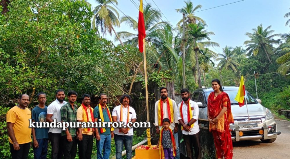 ಕುಂದಾಪುರ : ಕನ್ನಡ ರಾಜ್ಯೋತ್ಸವದ ಪ್ರಯುಕ್ತ ವಿಠಲವಾಡಿಯ ಭಗವಧ್ವಜ ಕಟ್ಟೆಯಲ್ಲಿ ಕನ್ನಡಪರ ಹೋರಾಟಗಾರ ದಿನೇಶ್ ಪುತ್ರನ್ ಧ್ವಜಾರೋಹಣ ನೆರವೇರಿಸಿದರು. ಬಳಿಕ ಮಾತನಾಡಿದ ಅವರು ಕುಂದಾಪುರ ತಾಲೂಕಿನ ಎಲ್ಲಾ ಅಂಗಡಿಗಳಲ್ಲಿ ಕನ್ನಡ ನಾಮಫಲಕ ಅಳವಡಿಸಬೇಕು. ರಾಜ್ಯದ ಎಲ್ಲಾ ಸರಕಾರಿ ಕಛೇರಿಗಳಲ್ಲಿ ಕನ್ನಡದಲ್ಲಿಯೇ ವ್ಯವಹರಿಸಿ, ಕನ್ನಡದಲ್ಲಿಯೇ ಆದೇಶಗಳನ್ನು ಹೊರಡಿಸಬೇಕು ಎಂದರು.
