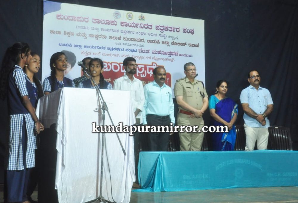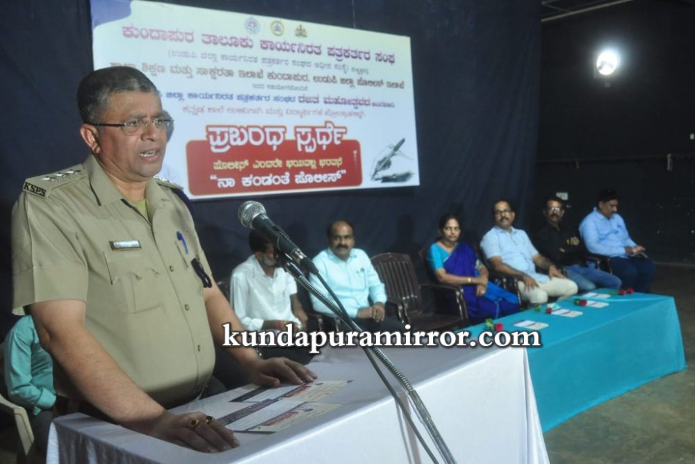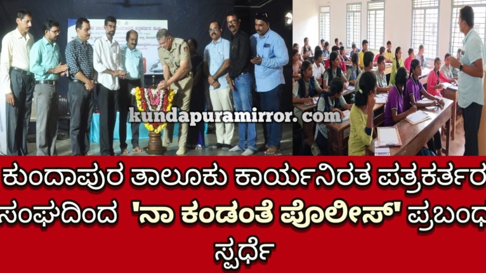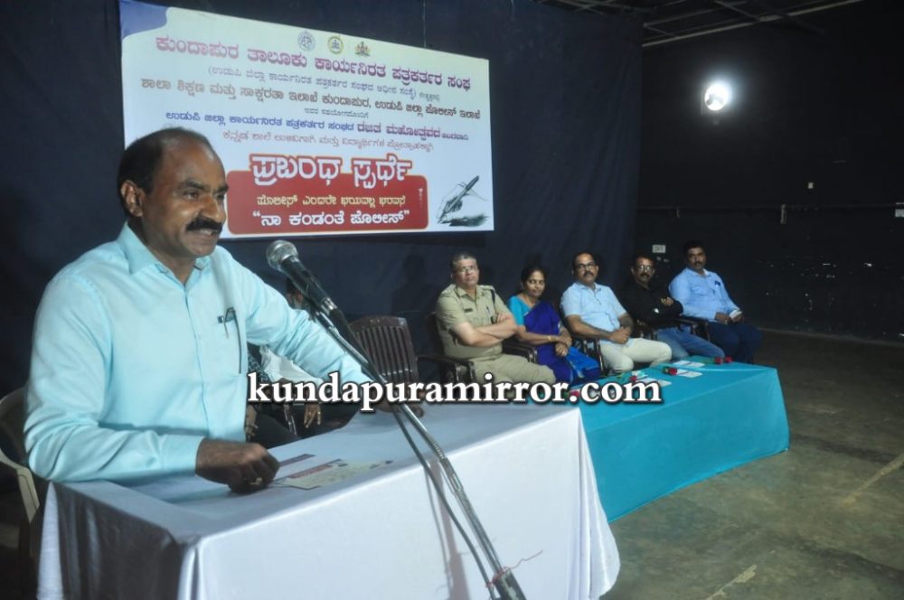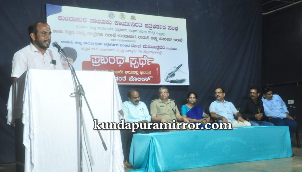 ಕುಂದಾಪುರ ತಾಲೂಕು ಕಾರ್ಯನಿರತ ಪತ್ರಕರ್ತರ ಸಂಘದ ನೇತೃತ್ವದಲ್ಲಿ ಶಾಲಾ ಶಿಕ್ಷಣ ಮತ್ತು ಸಾಕ್ಷರತಾ ಇಲಾಖೆ ಕುಂದಾಪುರ ಹಾಗೂ ಉಡುಪಿ ಜಿಲ್ಲಾ ಪೊಲೀಸ್ ಇಲಾಖೆಯ ಸಹಯೋಗದೊಂದಿಗೆ ಉಡುಪಿ ಜಿಲ್ಲಾ ಕಾರ್ಯನಿರತ ಪತ್ರಕರ್ತರ ಸಂಘದ ರಜತ ಮಹೋತ್ಸವದ ಅಂಗವಾಗಿ ಕನ್ನಡ ಶಾಲೆ ಉಳಿವಿಗಾಗಿ ಮತ್ತು ಪ್ರೋತ್ಸಾಹಕ್ಕಾಗಿ ಎಸ್.ಎಸ್.ಎಲ್.ಸಿ ವಿದ್ಯಾರ್ಥಿಗಳಿಗಾಗಿ ‘ನಾ ಕಂಡಂತೆ ಪೊಲೀಸ್’ ಎಂಬ ವಿಷಯದ ಕುರಿತು ಕುಂದಾಪುರ ಬೋರ್ಡ್ ಹೈಸ್ಕೂಲ್ನ ಕಲಾಮಂದಿರದಲ್ಲಿ ಪ್ರಬಂಧ ಸ್ಪರ್ಧೆ ಕಾರ್ಯಕ್ರಮವನ್ನು ಉದ್ಘಾಟಿಸಿ ಮಾತನಾಡಿದರು.