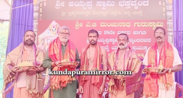 ಕುಂದಾಪುರ :ವಂಡ್ಸೆ ಸಮೀಪದ ಅಬ್ಬಿ ಚಿತ್ತೇರಿಯ ಶ್ರೀ ಬ್ರಹ್ಮಲಿಂಗೇಶ್ವರ ದೇವಸ್ಥಾನದಲ್ಲಿ ಶ್ರೀ ಅಯ್ಯಪ್ಪ ಸ್ವಾಮಿ ಭಕ್ತವೃಂದದ ಎ.ಜಿ ಮಂಜುನಾಥ ಗುರುಸ್ವಾಮಿ ಇವರ 18ನೇ ವರ್ಷದ ಹಾಗೂ ಅಯ್ಯಪ್ಪ ಭಕ್ತವೃಂದದವರ ಶಬರಿಮಲೈ ಯಾತ್ರೆಯ ಪ್ರಯುಕ್ತ ಗುರುವಂದನೆ ಕಾರ್ಯಕ್ರಮ ಜರಗಿತು.