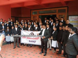 ಕುಂದಾಪುರ ವಕೀಲರ ಸಂಘದ ಅಧ್ಯಕ್ಷ ಬನ್ನಾಡಿ ಸೋಮನಾಥ ಹೆಗಡೆ ನೇತೃತ್ವದಲ್ಲಿ ಪ್ರತಿಭಟನೆ ನಡೆಯಿತು. ಈ ಸಂದರ್ಭ ಸೋಮನಾಥ ಹೆಗಡೆ ಮಾತನಾಡಿ, ಪೊಲೀಸರು ಹಾಗೂ ನ್ಯಾಯವಾದಿಗಳು ಒಂದು ನಾಣ್ಯದ ಎರಡು ಮುಖಗಳು ಇದ್ದ ಹಾಗೇ. ಆದರೆ, ಈಗಿನ ಕಾಲಘಟ್ಟದಲ್ಲಿ ರಾಜ್ಯಾದ್ಯಂತ ಪೊಲೀಸರು, ವಕೀಲರ ವಿರುದ್ಧ ಬೇರೆ ಬೇರೆ ಕಾರಣಕ್ಕೆ ಹಲ್ಲೆ ಮಾಡುತ್ತಿರುವುದು ನೋಡಿದರೆ ವಕೀಲರೆಲ್ಲ ಬೆಚ್ಚಿ ಬೀಳುವ ಸನ್ನಿವೇಶ ನಿರ್ಮಾಣವಾಗಿದೆ. ಈವಾಗಲೇ ವಕೀಲರ ಹಿತ ರಕ್ಷಣಾ ಸಮಿತಿ ಜಾರಿಗೆ ತರಬೇಕೆಂದು ಸರಕಾರಕ್ಕೆ ಮನವಿ ಮಾಡಿದ್ದೇವೆ ಹಾಗೂ ಯುವ ನ್ಯಾಯವಾದಿಯ ಮೇಲೆ ಅಮಾನುಷ ಹಲ್ಲೆ ನಡೆಸಿದವರ ಮೇಲೆ ತಕ್ಷಣ ಸರ್ಕಾರ, ತಪ್ಪಿತಸ್ಥ ಪೊಲೀಸರ ವಿರುದ್ಧ ಕ್ರಮ ಕೈಗೊಳ್ಳಬೇಕು ಎಂದು ಆಗ್ರಹಿಸಿದರು. ಈ ವೇಳೆ ಕುಂದಾಪುರ ವಕೀಲರ ಸಂಘದ ಎಲ್ಲಾ ಪದಾಧಿಕಾರಿಗಳು ಹಾಜರಿದ್ದರು.