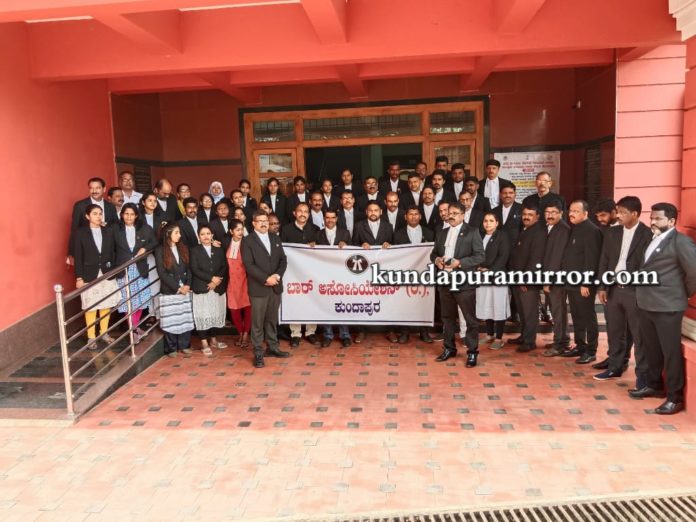 ಕುಂದಾಪುರ: ಚಿಕ್ಕಮಗಳೂರಿನ ಯುವ ನ್ಯಾಯವಾದಿ ಪ್ರೀತಮ್ ಅವರ ಮೇಲೆ ಚಿಕ್ಕಮಗಳೂರು ನಗರ ಪೊಲೀಸ್ ಠಾಣೆಯ ಸಬ್ ಇನ್ಸ್ಪೆಕ್ಟರ್ ಮತ್ತು ಇತರ ಪೊಲೀಸರು ನಡೆಸಿದ ಅಮಾನುಷ ಹಲ್ಲೆಯನ್ನು ಖಂಡಿಸಿ ಇವತ್ತು ಕುಂದಾಪುರ ವಕೀಲರ ಸಂಘದಿಂದ ಪ್ರತಿಭಟನೆ ನಡೆಯಿತು.