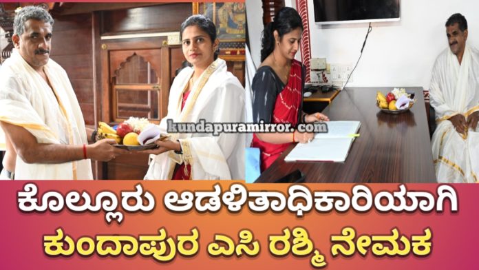ಕುಂದಾಪುರ: ಕೊಲ್ಲೂರು ಶ್ರೀ ಮೂಕಾಂಬಿಕಾ ದೇವಸ್ಥಾನದ ನೂತನ ಆಡಳಿತ ಅಧಿಕಾರಿಯಾಗಿ ಕುಂದಾಪುರ ಉಪ ವಿಭಾಗಾಧಿಕಾರಿ ರಶ್ಮಿ ಎಸ್ಆರ್ ಅಧಿಕಾರ ಸ್ವೀಕರಿಸಿದ್ದಾರೆ. ದೇವಸ್ಥಾನದ ಕಾರ್ಯನಿರ್ವಹಣಾಧಿಕಾರಿ ಪ್ರಶಾಂತ್ ಶೆಟ್ಟಿ ನೂತನ ಆಡಳಿತ ಅಧಿಕಾರಿ ರಶ್ಮಿಯವರಿಗೆ ಅಧಿಕಾರ ಹಸ್ತಾಂತರಿಸಿ ಸನ್ಮಾನಿಸಲಾಯಿತು.