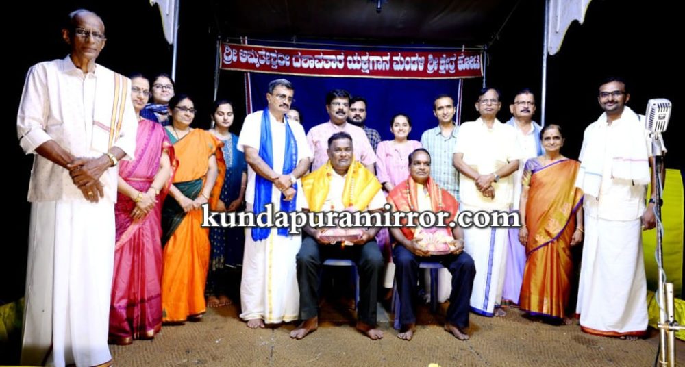 ಮೇಳದ ಹಿರಿಯ ಸ್ತ್ರೀವೇಷ ಕಲಾವಿದ ಮೊಳಹಳ್ಳಿ ಕೃಷ್ಣ ನಾಯಕ್ ಮತ್ತು ಎರಡನೇ ವೇಷಧಾರಿ ಕೋಟ ಸುರೇಶ್ ಅವರನ್ನು ಹೊಳ್ಳ ಕುಟುಂಬದ ಪರವಾಗಿ ಗೌರವ ಧನದೊಂದಿಗೆ ಸನ್ಮಾನಿಸಲಾಯಿತು. ಸ್ಥಳೀಯ ಯುವ ಪ್ರತಿಭೆ ಅಮೃತೇಶ್ವರಿ ಮೇಳದ ಸಂಗೀತಗಾರ ಚಂದ್ರಕಾಂತ್ ಅವರನ್ನು ಗುರುತಿಸಿ ಪ್ರೋತ್ಸಾಹಿಸಲಾಯಿತು.
