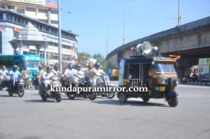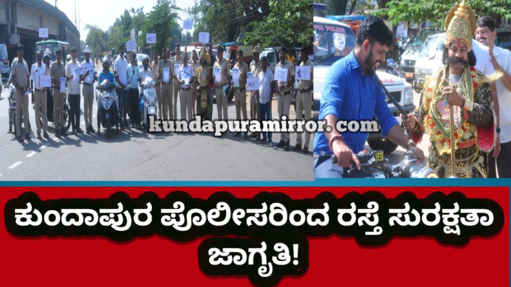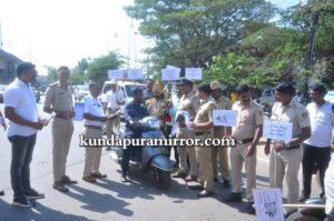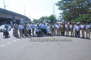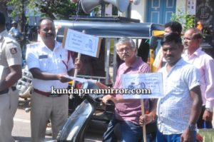 ಉಡುಪಿ ಜಿಲ್ಲಾ ಪೊಲೀಸ್ ವತಿಯಿಂದ ರಸ್ತೆ ಸುರಕ್ಷತಾ ಸಪ್ತಾಹ ಅಂಗವಾಗಿ ನಡೆದ ಈ ಜಾಗೃತಿ ಕಾರ್ಯಕ್ರಮದಲ್ಲಿ ಕುಂದಾಪುರದ ಶಾಸ್ತ್ರೀ ವೃತ್ತದಲ್ಲಿ ಪೊಲೀಸ್ ವೃತ್ತ ನಿರೀಕ್ಷಕ ನಂದಕುಮಾರ್, ನಗರ ಠಾಣೆ ಉಪನಿರೀಕ್ಷಕರ ವಿನಯ್ ಕೊರ್ಲಹಳ್ಳಿ, ಸಂಚಾರಿ ಉಪನಿರೀಕ್ಷಕ ಸುಬ್ಬಣ ಸೇರಿದಂತೆ ಪೊಲೀಸರು ಜಾಗೃತಿ ಕಾರ್ಯಾಚರಣೆಯಲ್ಲಿ ಭಾಗವಹಿಸಿದರು. ಅತೀ ವೇಗದ ಚಾಲನೆ, ವಾಹನ ನಿಲ್ಲುವ ಮೊದಲೇ ಹತ್ತುವುದು ಅಥವಾ ಇಳಿಯುವುದು ರಸ್ತೆ ಪಕ್ಕದಲ್ಲಿ ಗುಂಪಾಗಿ ಸಂಚರಿಸುವುದು, ಚಾಲನೆ ಸಂದರ್ಭ ಮೊಬೈಲ್ ಬಳಸುವುದು, ಅವಕಾಶವಿಲ್ಲದ ಸ್ಥಳದಲ್ಲಿ ಸಂಚಾರ, ಕರ್ಕಶ ಹಾರ್ನ್ ಇತ್ಯಾದಿ ನಿಯಮಗಳ ಉಲ್ಲಂಘನೆಗಳ ಬಗ್ಗೆ ಮಾಹಿತಿ ನೀಡಿದರು. ಸಂದರ್ಭ ಕರಪತ್ರಗಳು ಹಾಗೂ ಆಟೋ ರಿಕ್ಷಾದಲ್ಲಿ ಧ್ವನಿವರ್ಧಕಗಳ ಮೂಲಕವೂ ಜಾಗೃತಿ ಮೂಡಿಸಲಾಯಿತು.
