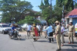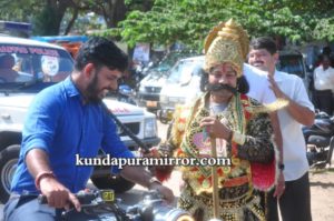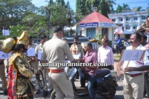 ಕುಂದಾಪುರ: ಕುಂದಾಪುರ ಸಂಚಾರಿ ಪೊಲೀಸರು ಮಂಗಳವಾರ ವಾಹನ ಚಾಲಕರಿಗೆ ಸಂಚಾರ ಜಾಗೃತಿ ಮೂಡಿಸಿದ್ದಾರೆ. ನಿಯಮ ಮೀರಿ ಸಂಚರಿಸಿದರೆ ಯಮನ ಪಾದ ಸೇರಬೇಕಾಗುತ್ತದೆ ಎನ್ನುವ ಸೂಚನೆ ನೀಡಲು ಸ್ವತಃ ಯಮನ ಪಾತ್ರಧಾರಿಯನ್ನೂ ಪಕ್ಕದಲ್ಲಿಯೇ ನಿಲ್ಲಿಸಿಕೊಂಡು ಚಾಲಕರಿಗೆ ಹೂ ಕೊಟ್ಟು ಜಾಗ್ರತಿ ಮೂಡಿಸಲಾಯಿತು.