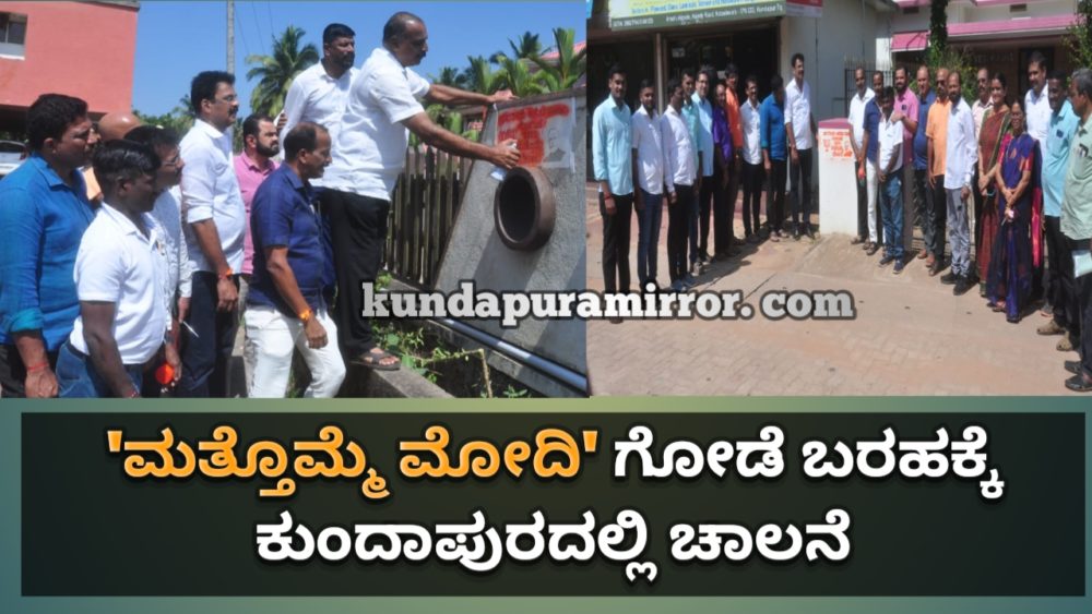 ಕುಂದಾಪುರ: ಕೋಟೇಶ್ವರ ಮಹಾಶಕ್ತಿ ಕೇಂದ್ರದ ವತಿಯಿಂದ ಮುಂದಿನ ಲೋಕಸಭಾ ಚುನಾವಣೆಗೆ ಸಂಬಂಧಿಸಿ ಮತ್ತೊಮ್ಮೆ ಮೋದಿ 3.0 ಗೋಡೆ ಬರಹ ಅಭಿಯಾನಕ್ಕೆ ಕುಂದಾಪುರದಲ್ಲಿ ಚಾಲನೆ ನೀಡಲಾಯಿತು. ಕುಂದಾಪುರ ಶಾಸಕ ಎ. ಕಿರಣ್ ಕುಮಾರ್ ಕೊಡ್ಗಿ ಕೋಟೇಶ್ವರದ ಮಾರ್ಕೊಡು ಸುಧೀರ್ ಕುಮಾರ್ ಶೆಟ್ಟಿ ಯವರ ಅಪಾರ್ಟ್ಮೆಂಟಿನ ಮುಂಭಾಗದಲ್ಲಿ ಸ್ಪ್ರೇ ಸಿಂಪಡಿಸಿ ಕಾರ್ಯಕ್ರಮಕ್ಕೆ ಚಾಲನೆ ನೀಡಿದರು.