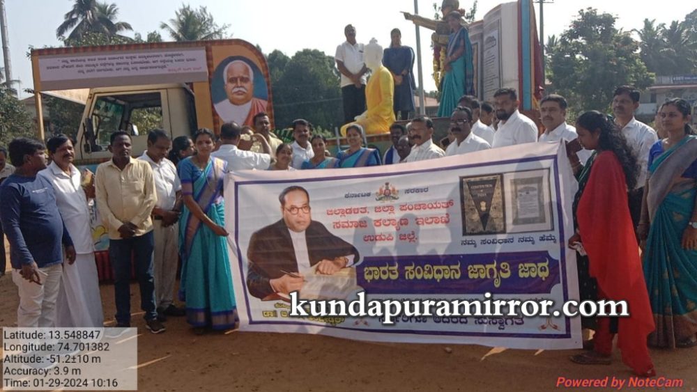 ಸಂವಿಧಾನ ಜಾಗೃತಿ ಜಾಥಾಕ್ಕೆ ಶಾಸಕ ಕಿರಣ್ ಕುಮಾರ್ ಕೊಡ್ಗಿ ಚಾಲನೆ ನೀಡಿ, ಅಂಬೇಡ್ಕರ್ ಭಾವಚಿತ್ರಕ್ಕೆ ಮಾಲಾರ್ಪಣೆ ಮಾಡಿ ಮಾತನಾಡಿ, ಸಮ್ಮ ದೇಶವೂ ಸಂವಿಧಾನದ ಆಶಯದ ಮೇಲೆ ನಡೆಯುತ್ತಿದೆ ಸಂವಿಧಾನದ ಮಹತ್ವ ಮತ್ತು ಮೌಲ್ಯವನ್ನು ಪ್ರತಿಯೊಬ್ಬರು ಅರಿವನ್ನು ಹೊಂದಬೇಕು ಸಂವಿಧಾನದ ಚೌಕಟ್ಟಿನಲ್ಲಿ ಎಲ್ಲರೂ ಸಮಾನರು ಈ ಜಾಥಾ ಕಾರ್ಯಕ್ರಮಕ್ಕೆ ಗ್ರಾಮೀಣ ಪ್ರದೇಶದಲ್ಲಿ ಪ್ರತಿಯೊಬ್ಬರು ಭಾಗವಹಿಸಿ ಕಾರ್ಯಕ್ರಮವನ್ನು ಯಶಸ್ವಿಗೊಳಿಸಬೇಕು ಎಂದರು.