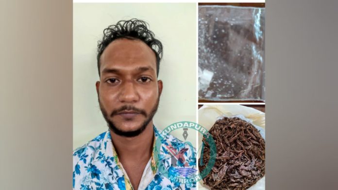 ಕುಂದಾಪುರ: ಉಡುಪಿ ಜಿಲ್ಲಾ ಪೊಲೀಸ್ ಅಧೀಕ್ಷಕ ವಿಷ್ಣುವರ್ಧನ್ ಎನ್ ರವರ ನಿರ್ದೇಶನದಲ್ಲಿ, ಹೆಚ್ಚುವರಿ ಪೊಲೀಸ್ ಅಧೀಕ್ಷಕ ಕುಮಾರಚಂದ್ರ ರವರ ಮಾರ್ಗದರ್ಶನದಲ್ಲಿ ಕುಂದಾಪುರ ಪೊಲೀಸ್ ಉಪವಿಭಾಗದ ಉಪಾಧೀಕ್ಷಕ ಶ್ರೀಕಾಂತ್ ಕೆ ರವರು ಅ.21ರಂದು ರಾತ್ರಿ ಕರ್ತವ್ಯದಲ್ಲಿದ್ದ ಸಮಯ ಕುಂದಾಪುರ ಶಾಸ್ತ್ರೀಪಾರ್ಕ್ ಬಳಿ ಅನುಮಾನಸ್ಪದವಾಗಿ ಕಂಡು ಬಂದ ಮಹಮ್ಮದ್ ಜಾಫರ್ ಗುಡುಮಿಯಾ, (28 ವ) ಕಾರವಾರ, ಎಂಬವನನ್ನು ದಸ್ತಗಿರಿ ಮಾಡಿ ಒಟ್ಟು 1 ಕೆ.ಜಿ 800 ಗ್ರಾಂ ತೂಕದ ಗಾಂಜಾ ಅಂದಾಜು ಮೌಲ್ಯ 40,000 ರೂಪಾಯಿ ಹಾಗೂ ೦೧ ಗ್ರಾಂ ಬ್ರೌನ್ ಶುಗರ್ ಅಂದಾಜು ಮೌಲ್ಯ 10,000 ರೂಪಾಯಿ, 2 ಮೊಬೈಲ್ ಫೋನ್, 1,500 ರೂಪಾಯಿ ನಗದನ್ನು ಸ್ವಾಧೀನಪಡಿಸಿಕೊಂಡು ಕುಂದಾಪುರ ಪೊಲೀಸ್ ಠಾಣೆಗೆ ಹಸ್ತಾಂತರಿಸಿದ್ದು ಕುಂದಾಪುರ ಪೊಲೀಸ್ ಠಾಣೆಯಲ್ಲಿ ಪ್ರಕರಣ ದಾಖಲಾಗಿದೆ. ಈ ಕಾರ್ಯಚರಣೆಯಲ್ಲಿ ಕುಂದಾಪುರ ಪೊಲೀಸ್ ಉಪಾಧೀಕ್ಷಕರ ಕಛೇರಿಯ ಅಪರಾಧ ವಿಭಾಗದ ಸಿಬ್ಬಂದಿಯವರಾದ ರಾಘವೇಂದ್ರ ಉಪ್ಪುಂದ, ರಾಮು ಹೆಗ್ಡೆ, ವಿಜಯ ಕುಮಾರ್, ರಮೇಶ ಕುಲಾಲ್, ಕುಂದಾಪುರ ಪೊಲೀಸ್ ಠಾಣೆಯ ರಾಘವೇಂದ್ರ ಮೊಗೇರ ಮತ್ತು ವಿಜೇತ್ ಹಾಗೂ ಜೀಪು ಚಾಲಕರಾದ ರಾಜು ಭಾಗವಹಿಸಿದ್ದರು.
