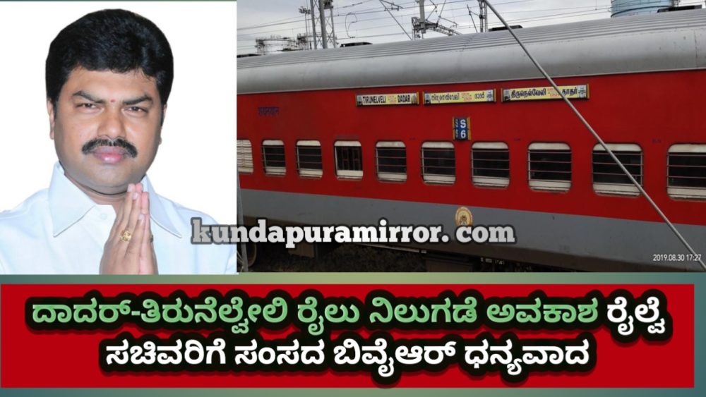 ಕುಂದಾಪುರ : ದಾದರ್-ತಿರುನೆಲ್ವೆಲಿ ಎಕ್ಸ್ ಪ್ರೆಸ್ ರೈಲು ಸಂಖ್ಯೆ 22629/22630 ರೈಲನ್ನು ಬೈಂದೂರು ಮೂಕಾಂಬಿಕಾ ರೈಲ್ವೇ ನಿಲ್ದಾಣದಲ್ಲಿ ನಿಲುಗಡೆ ಅವಕಾಶ ನೀಡಿದ ಕೇಂದ್ರ ರೈಲ್ವೇ ಸಚಿವರಾದ ಅಶ್ವಿನಿ ವೈಷ್ಣವ್ ಅವರಿಗೆ ಸಂಸದ ಬಿ.ವೈ. ರಾಘವೇಂದ್ರ ಧನ್ಯವಾದನ್ನು ಹೇಳಿದ್ದಾರೆ.