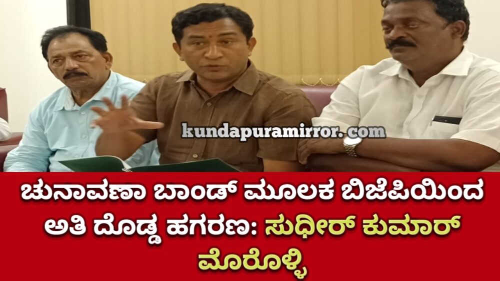 ಬ್ರಹ್ಮಾವರ: ಚುನಾವಣಾ ಬಾಂಡ್ ಮೂಲಕ ದೇಶದಲ್ಲಿ ಅತಿ ಹೆಚ್ಚು ದೇಣಿಗೆ ಪಡೆಯುವ ಮೂಲಕ ಬಿಜೆಪಿ ದೊಡ್ಡ ಹಗರಣ ಮಾಡಿದೆ ಎಂದು ಕಾಂಗ್ರೆಸ್ ಕೆ.ಪಿ.ಸಿ.ಸಿ. ರಾಜ್ಯ ವಕ್ತಾರರಾದ ಸುಧೀರ್ ಕುಮಾರ್ ಮೊರೊಳ್ಳಿ ಆಪಾದಿಸಿದ್ದಾರೆ.