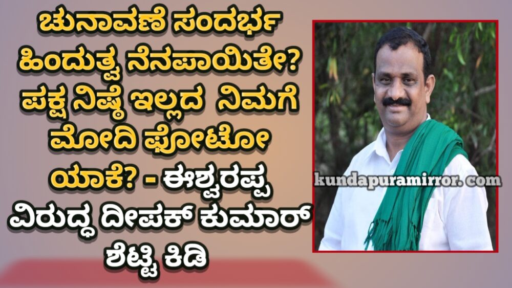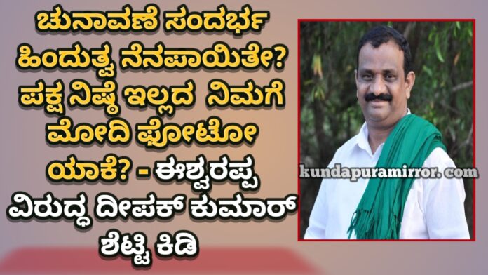 ಬೈಂದೂರು: ಶಿವಮೊಗ್ಗ ಲೋಕಸಭಾ ಕ್ಷೇತ್ರಕ್ಕೆ ಭಾರತೀಯ ಜನತಾ ಪಕ್ಷದ ಅಧಿಕೃತ ಅಭ್ಯರ್ಥಿಯಾಗಿ ಬಿ.ವೈ. ರಾಘವೇಂದ್ರ ಅವರನ್ನು ಪಕ್ಷದ ವರಿಷ್ಠರೇ ಆಯ್ಕೆ ಮಾಡಿದ್ದರೂ ಪಕ್ಷದ ನಿಲುವನ್ನು ಒಪ್ಪಿಕೊಳ್ಳದ ಈಶ್ವರಪ್ಪನವರ ಬಗ್ಗೆ ಮಾತನಾಡುವ ನೈತಿಕತೆ ಈಶ್ವರಪ್ಪನವರಿಗಿಲ್ಲ ಎಂದು ಬುಜೆಪಿ ಬೈಂದೂರು ಮಂಡಲ ಅಧ್ಯಕ್ಷ ದೀಪಕ್ ಕುಮಾರ್ ಶೆಟ್ಟಿ ಕಿಡಿ ಕಾರಿದ್ದಾರೆ. ಬೈಂದೂರಿನಲ್ಲಿ ಹಿಂದುತ್ವದ ಬಗ್ಗೆ ಮಾತನಾಡಿದರೆ ಬದಲಾವಣೆಯಾಘುತ್ತದೆ ಎನ್ನುವ ಭ್ರಮೆ ಬೇಡ ಎಂದು ಈಶ್ವರಪ್ಪಗೆ ಕಿವಿಮಾತು ಹೇಳಿದ್ದಾರೆ.